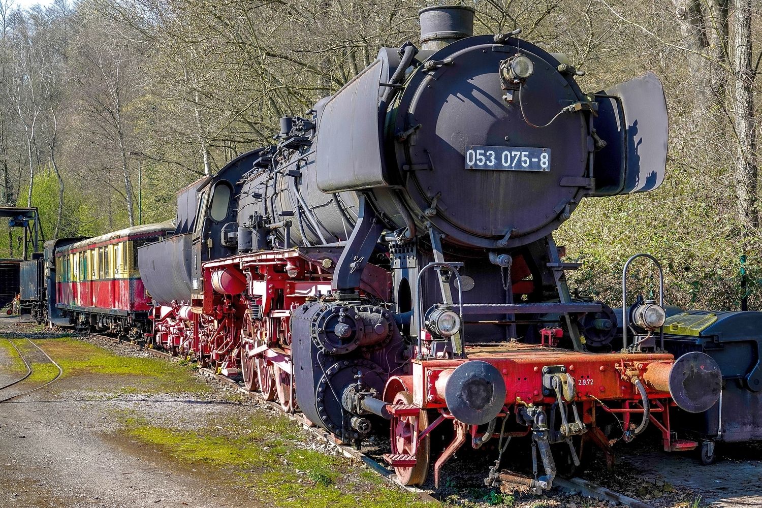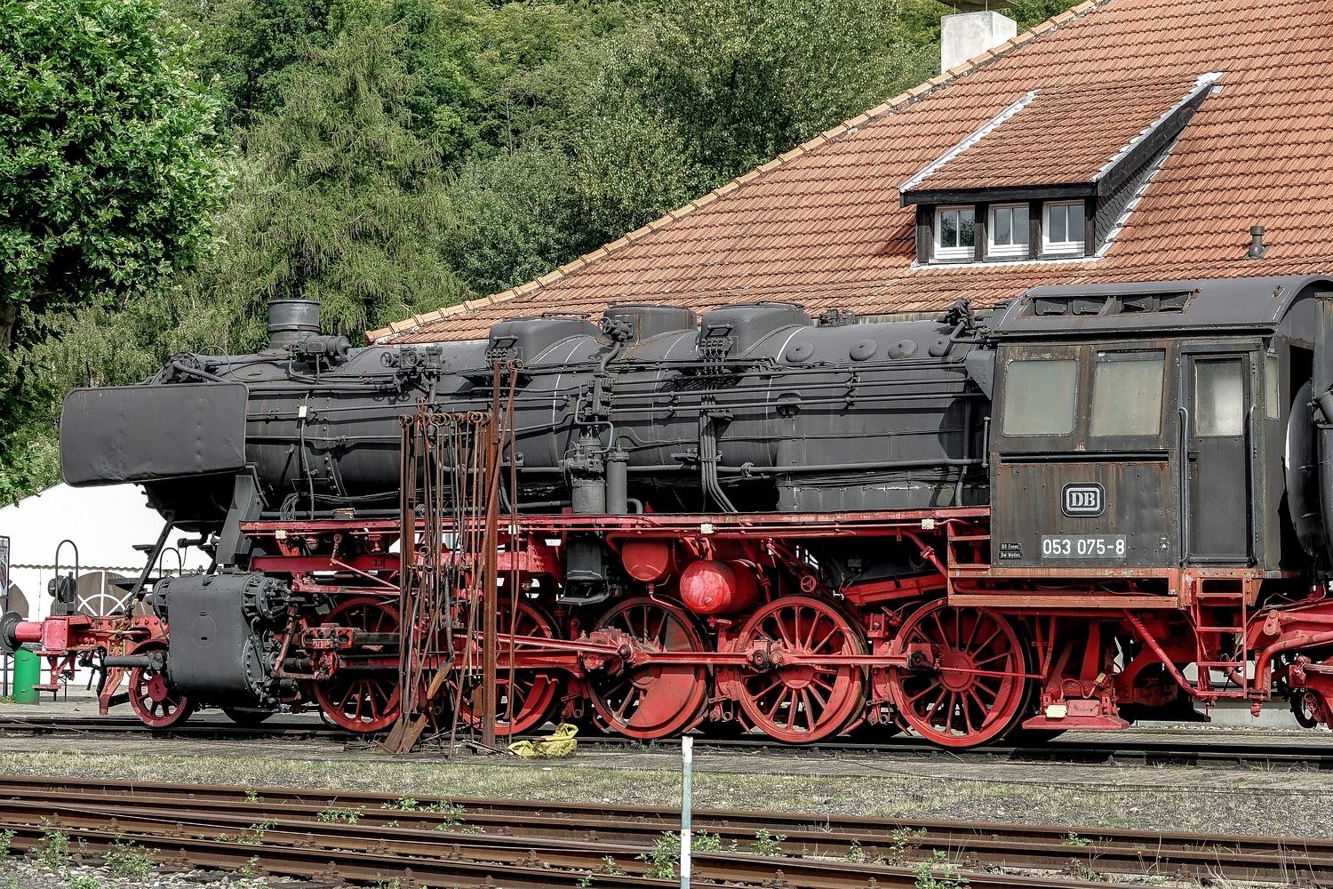 Die Baureihe 50 wurde ab 1939 von der Deutschen Reichsbahn in Dienst gestellt. Von dieser „modernen“, als Ersatz für ältere Länderbahn-Dampflokomotiven geplanten Güterzug-Maschine, sollten ursprünglich ca. 1200 Stück beschafft werden. Die Lokomotiven sollten in der Lage sein, auch auf Nebenbahnen mit nur schwachem Oberbau und oftmals schlecht verlegten Gleisen verkehren zu können. Der Rost war auch für die Verwertung von minderwertigem Brennstoff ausgelegt. So konnten die Maschinen im Hinblick auf einen geplanten Krieg praktisch europaweit eingesetzt werden. Aufgrund der politischen Begleitumstände, die Deutsche Reichsbahn musste bis dahin noch nicht gekannte Transportaufgaben bewältigen, wurden die Maschinen auch noch im 2. Weltkrieg von verschiedenen Lokfabriken, auch in den von Deutschland besetzten Ländern, gebaut. Während der Beschaffungszeit wurde die Bauart der Lokomotiven vereinfacht und zahlreiche Maschinen als Übergangs-Kriegslokomotiven (ÜK) in Dienst gestellt. Aus dieser vereinfachten Bauart entwickelte die Deutsche Reichsbahn später die Kriegslokomotive der Baureihe 52, die in über 6000 Exemplaren gebaut wurde. Wegen ihrer Höchstgeschwindigkeit von 80 km/h standen neben Güterzügen stets Personen- und Eilzüge und sogar Schnellzüge auf dem Betriebsprogramm. Viele Urlauberzüge, die über Nebenbahnen z.B. ins Sauerland oder an die Ostsee verkehrten, wurden von Lokomotiven der BR 50 befördert. Zahlreiche Maschinen waren im Ruhrgebiet und somit auch in auch Bochum-Dahlhausen beheimatet. Die hier erhaltene Maschine wurde 1943 als ÜK-Lokomotive mit der Betriebsnummer 50 3075 in Dienst gestellt. Ab 1968 trugen die Loks der BR 50 die computergerechte Baureihen-Bezeichnung 050 bis 053. Letztes Bahnbetriebswerk der DB, das noch 50er einsetzte, war Duisburg-Wedau. Dort war auch 053 075-8 bis zu ihrer Ausmusterung 1976 im Dienst. Danach wurde sie als technisches Denkmal auf dem Gelände der Fa. Vignold in Ratingen aufgestellt. Seit 1997 ist sie im Eisenbahnmuseum Bochum-Dahlhausen. Die 053 075-8 war die letzte Dampflok der BR 50 der DB mit einem Wannentender der Kriegslokomotiven. Das allseitig geschlossene Führerhaus der ÜK-Loks bot dem Lokpersonal einen guten Schutz gegen die Witterung bei Rückwärtsfahrten.