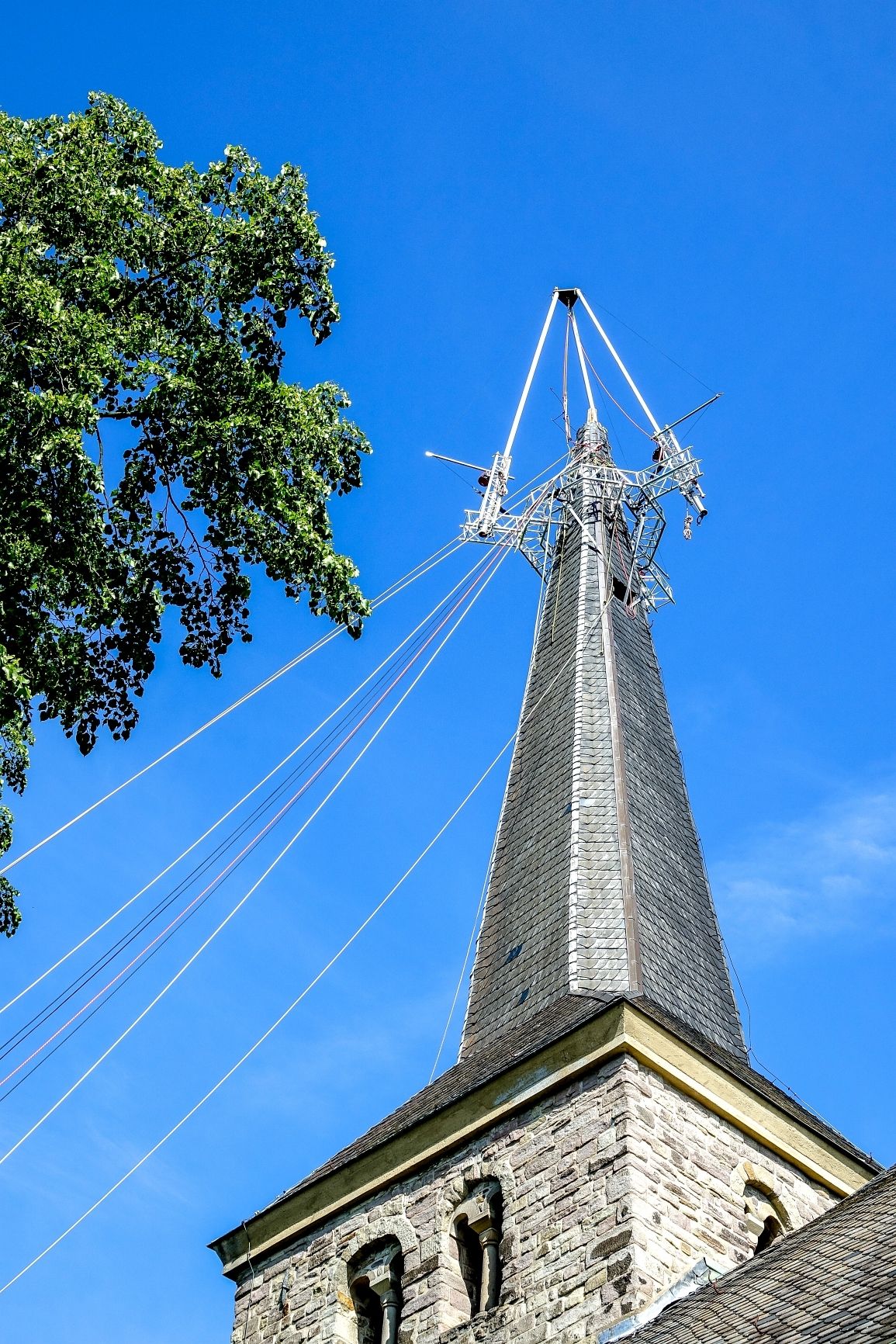 Frei von Furcht vor Schwindel und Höhe sollte sein, wer für die Firma „Seilkonzept“ aus Kassel arbeitet. Die Höhenkletterer haben sich darauf spezialisiert, Wartungs- und Reparaturarbeiten an nahezu allen Gebäuden gleich welcher Größe durchzuführen. Ihr Ziel erreichen sie dabei nicht bequem über ein Gerüst oder einen Kran, sondern akrobatisch und nahezu frei hängend mittels ausgeklügelter Seilzugtechnik. Ihre jüngste Mission führt ein dreiköpfiges Team dieser Spezialfirma jetzt für zwei Tage her zur Dorfkirche. Ihr Auftrag: die Kirchturmspitze, die aus einem Hahn und einem Kreuz besteht, wieder in aufrechte Position zu bringen. Denn seit einem schweren Sturm vor eineinhalb Jahren hängt die Spitze sichtbar auf Halbmast. Mehrere Möglichkeiten wurden durchgespielt: So hätte man das komplette Kirchengebäude einrüsten können. Oder man hätte mit einem riesigen Kran vom Parkplatz aus die Spitze erreichen können. Alles sehr aufwändig und teuer. Gemeinsam mit der Versicherung entschied sich die Kirchengemeinde dazu, die Höhenkletterer von „Seilkonzept“ mit den Arbeiten zu betrauen. Kosten für die Montage und die Reparatur des Kreuzes: etwa 20.000 Euro.