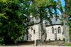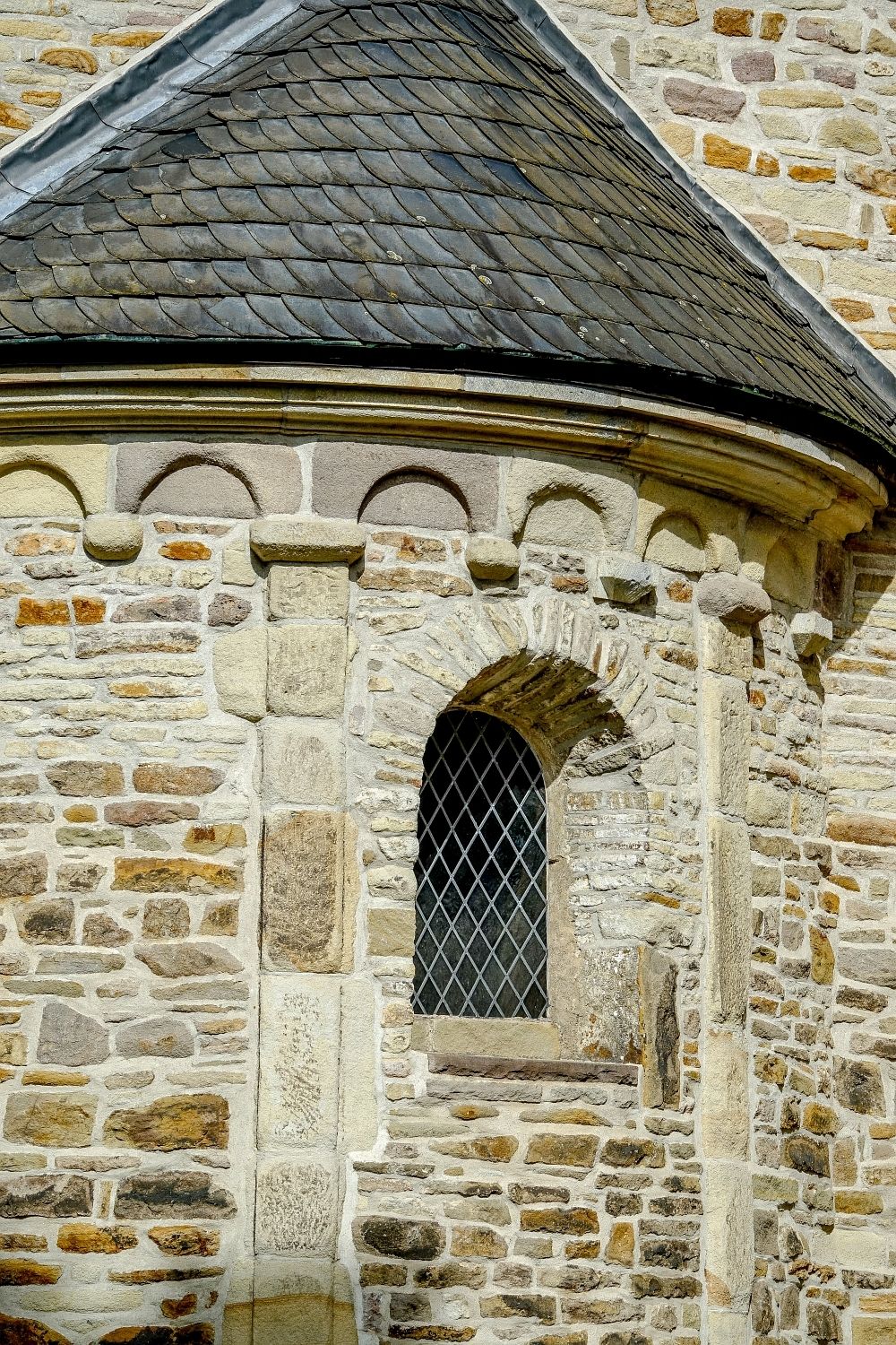 ▲ Blick auf den nachträglich angebauten gotischen Chor und die romanischen Bauteile des Nordquerhauses mit der kleinen Seitenapsis, dem Rundbogenfries darüber und den Lisenen auf der Ostwand und der Nordwand des Querhauses. Gen Westen wird die Außenmauer der gotischen Erweiterung des Seitenschiffs sichtbar, mit größerem Spitzbogenfenster und fehlendem Rundbogenfries. Dahinter erscheint der zum romanischen Baukörper gehörige Westturm.