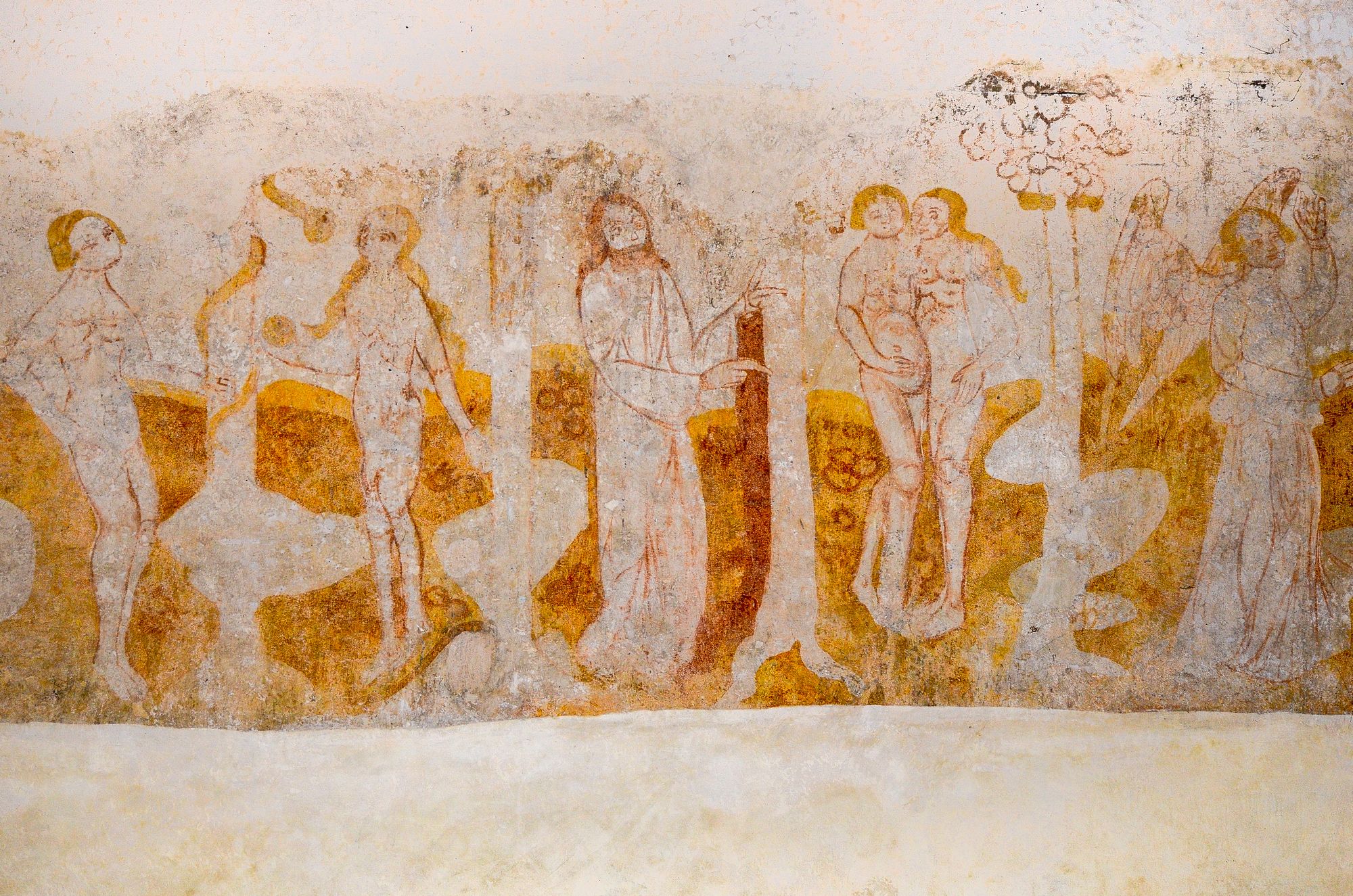 Im nördlichen Seitenschiff ist die Paradiesgeschichte dargestellt. Vier aufeinander folgende Szenen, jeweils durch den Baum der Erkenntnis gegliedert, bilden eine Bildergeschichte, ein Fries, 4,40 m lang und 1,20 m hoch, 1,40 m über dem Boden beginnend. Links sieht man die Erschaffung Adams und Evas. Warnend verweist Gott die niederknienden Menschen auf den die Szene rechts abgrenzenden Baum der Erkenntnis des Guten und Bösen. Es folgt die Versuchung, links Adam, rechts Eva, dazwischen der Baum, um den sich die Schlange ringelt. Szene Nummer drei ist die Verfluchung. Zwischen Gott und den Menschen steht der Baum der Erkenntnis, steht die Sünde. Gottes Füße sind abgewandt, während seine Hände strafend zu Adam und Eva gerichtet sind. Der letzte Akt zeigt die Vertreibung aus dem Paradies. Der Engel verweist das Paar aus dem Garten Eden. Nackt geht es, aneinandergeschmiegt, von dannen. Rotbraune Zeichnung und im unteren Bereich eine etwas dunkler angedeutete leicht hügelige Bodenfläche charakterisieren als Gestaltungsmittel diesen Bilderzyklus.