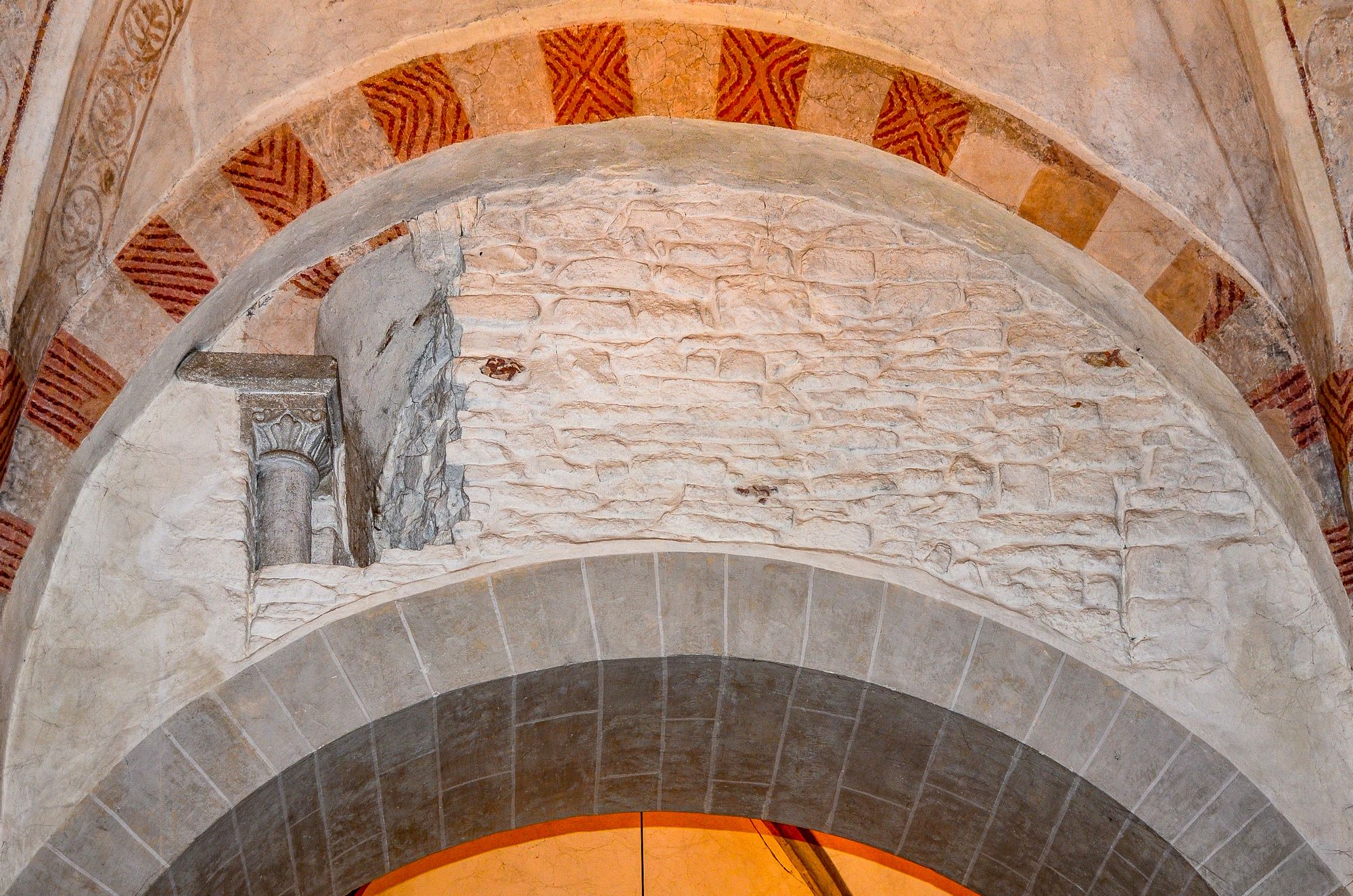 ▲ Interessant sind die Reste der ehemaligen Fensteröffnungen auf der südlichen Scheidbogenwand, dem ehemaligen Obergaden der kleinen Basilika. Ein Teil einer Fenstersäule mit Schaft, Kapitell und Kämpfer ist bei der Maueröffnung zutage getreten, die noch eine dem übrigen Gewölbe entsprechende Marmorierung auf ihrer Bogenstirn zeigt.