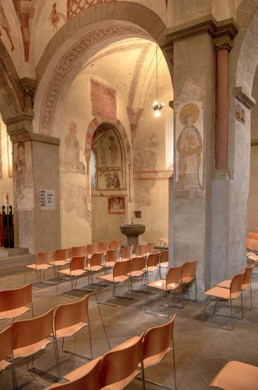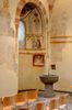 ▲ Gegenüber der Vielfalt der Malereien ist die Innenausstattung eher karg. Den Besucher empfangen gleich beim Betreten der Kirche auf den Westseiten der beiden Langhauspfeiler zwei gedrungene, quer gelagerte Reliefs (oben links und rechts im Bild). Der Löwe links verweist in seiner Eingangssymbolik auf den Kampf zwischen Christus und dem Satan, rechts als geflügelter Drache mit Ringelschwanz dargestellt. Aus der Zeit, in der das (jetzt zugemauerte) Nordwestportal der Hauptzugang war, stammt das Weihwasserbecken am Nordpfeiler.
