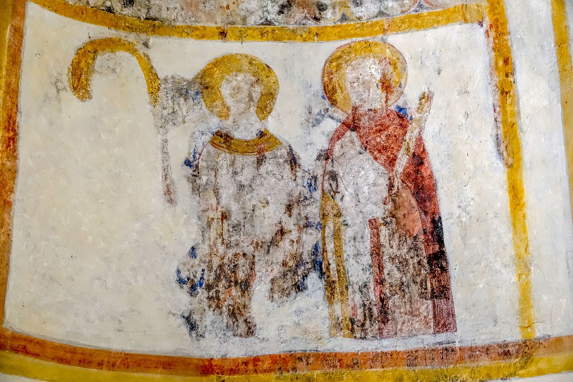 Weitere nur noch schwer identifizierbare Figuren, wohl auch Apostel, befinden sich auf der Südwand, neben der südlichen Apsis und auf einem Chorpfeiler.