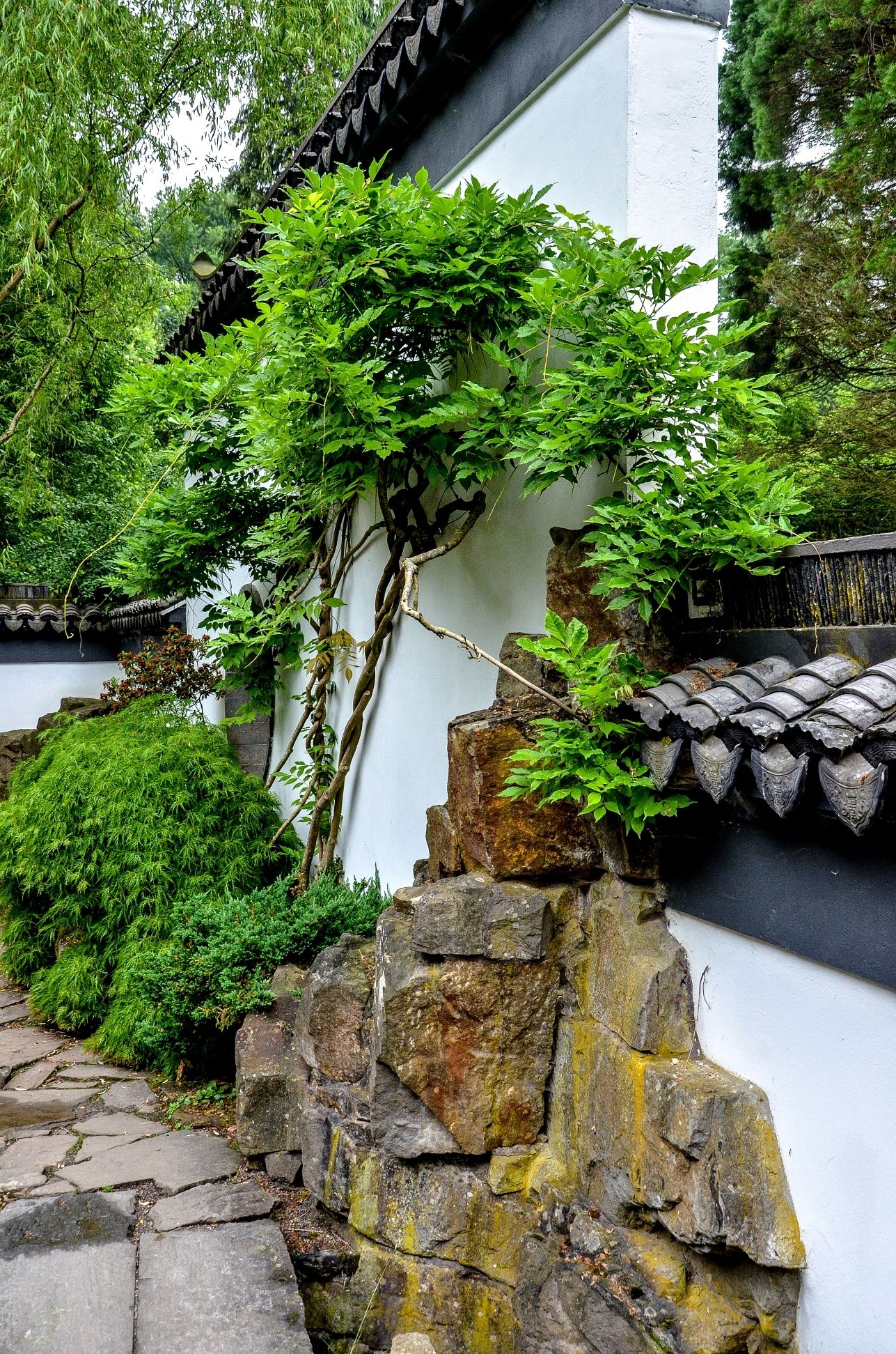 Im Weiteren gelangt man zu der naturgetreuen Nachbildung einer Bergregion aus zerklüfteten Felsen, wo zwischen den Felsen ein Gebirgsbach in einer Berghöhle entspringt. Bei der Gestaltung eines chinesischen Gartens folgt man dem Prinzip: „Obwohl von Menschenhand erschaffen, scheint es von der Natur geformt zu sein“. Um die Höhe des Berges zu betonen, wurde die angrenzende Mauer mit der Absicht verringert, als Gegensatz zur Majestät des Berges zu erscheinen.