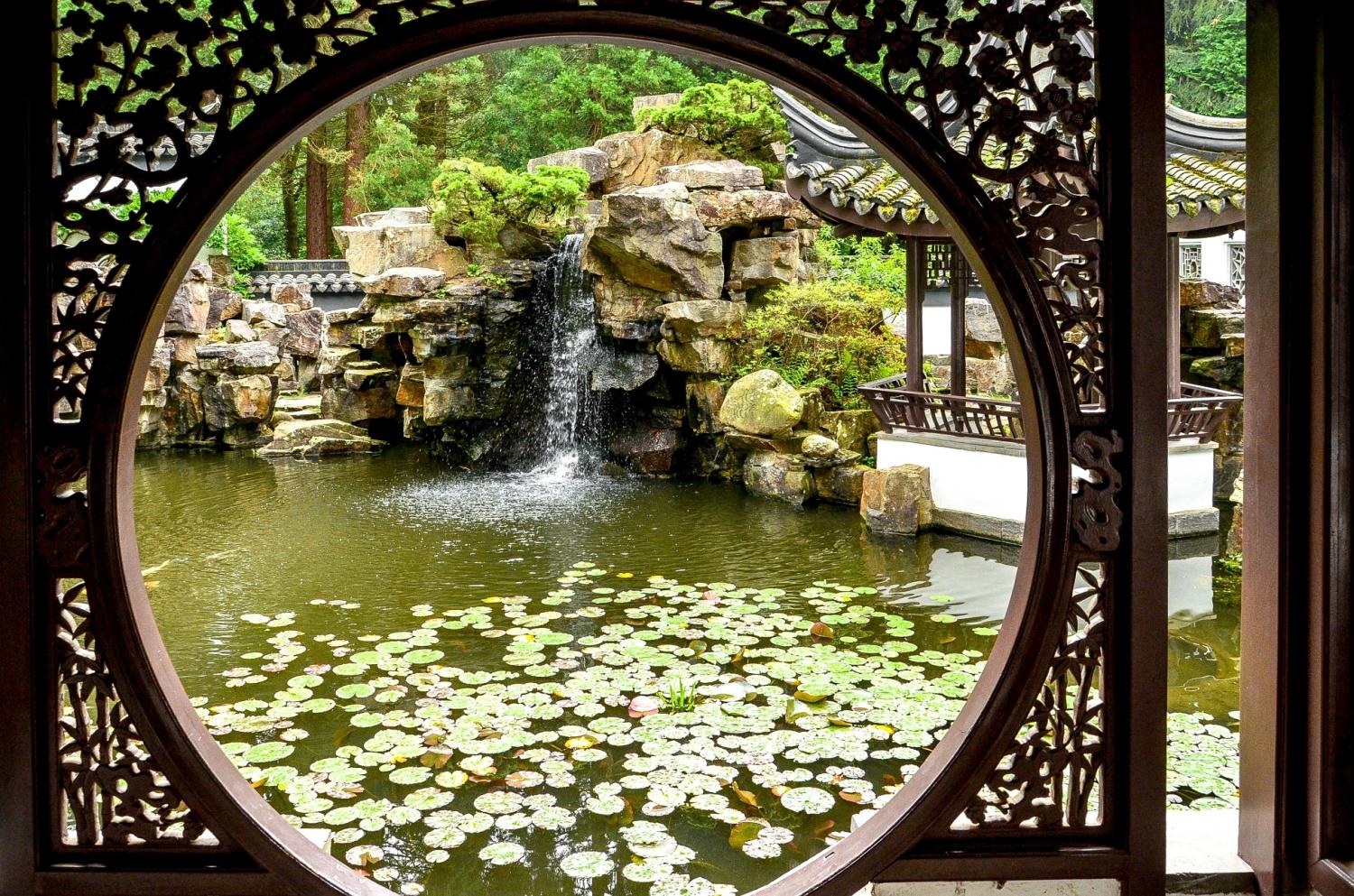 Neben dem Gedicht geht eine Treppe hinab zu einem Raum, durch dessen kreisrunde Öffnung man einen wunderbaren Blick auf den Garten hat, mit Seerosen direkt davor. In dem kleinen Raum ist vor einiger Zeit eine Zither-Spielerin aufgetreten. Überhaupt ist der Chinesische Garten ein kultureller Ort. 2010 fand hier ein Jazzkonzert statt. Auch Lesungen wurden im Garten veranstaltet.