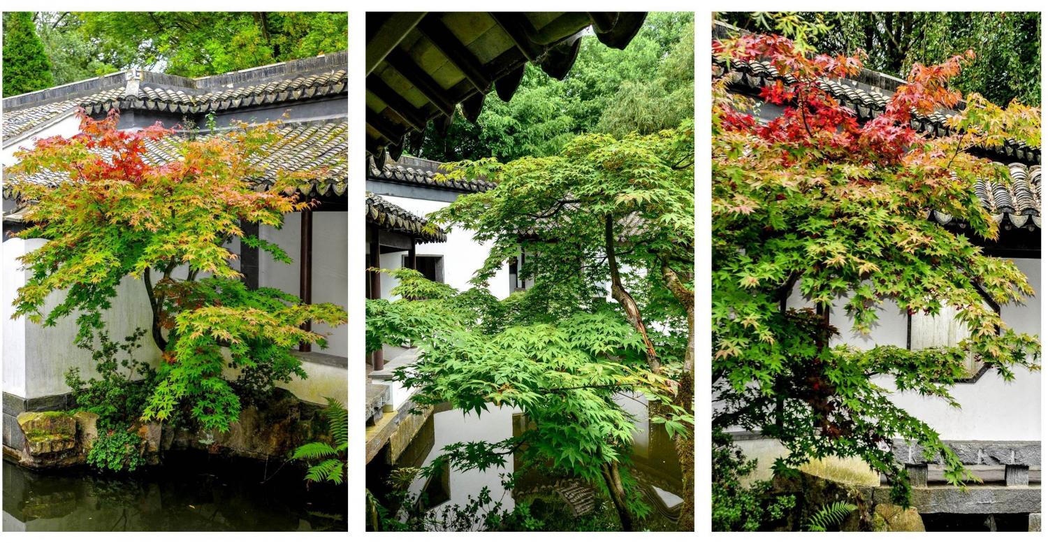Die Farben der Pflanzen können den Wechsel der Jahreszeiten am besten präsentieren. Ob mit Beginn des Frühlings oder des Sommers, sie erscheinen über der Mauer oder in den Ecken des Wandelgangs und überraschen den Besucher. Die von roter Farbe durchleuchtete Herbstlandschaft ist eine von Natur aus gegebene Schönheit. Das leuchtende Rot berührt das Herz der Besucher. Es erinnert an den schönen Vers des Dichters Du Mu (803–852): „Lass den Wagen dem Ahornwald zuliebe anhalten und uns den Abend genießen. Wie rot die Ahornblätter sind!“ Der Herbst ist Erntezeit und auch die bunte Jahreszeit, wenn Rot, Orange, Gelb und Grün sich an Faszination übertreffen. Ob oben auf den Mauern oder unten auf dem Boden, überall entfaltet sich die herbstliche Farbenpracht. Herrlich, schön, edel, leuchtend. Die Farben schmücken den kleinen Garten je nach Perspektive überall verschiedenartig, aber überall entzückend.