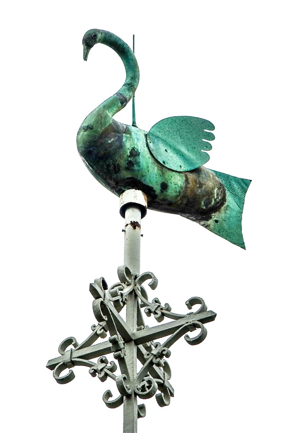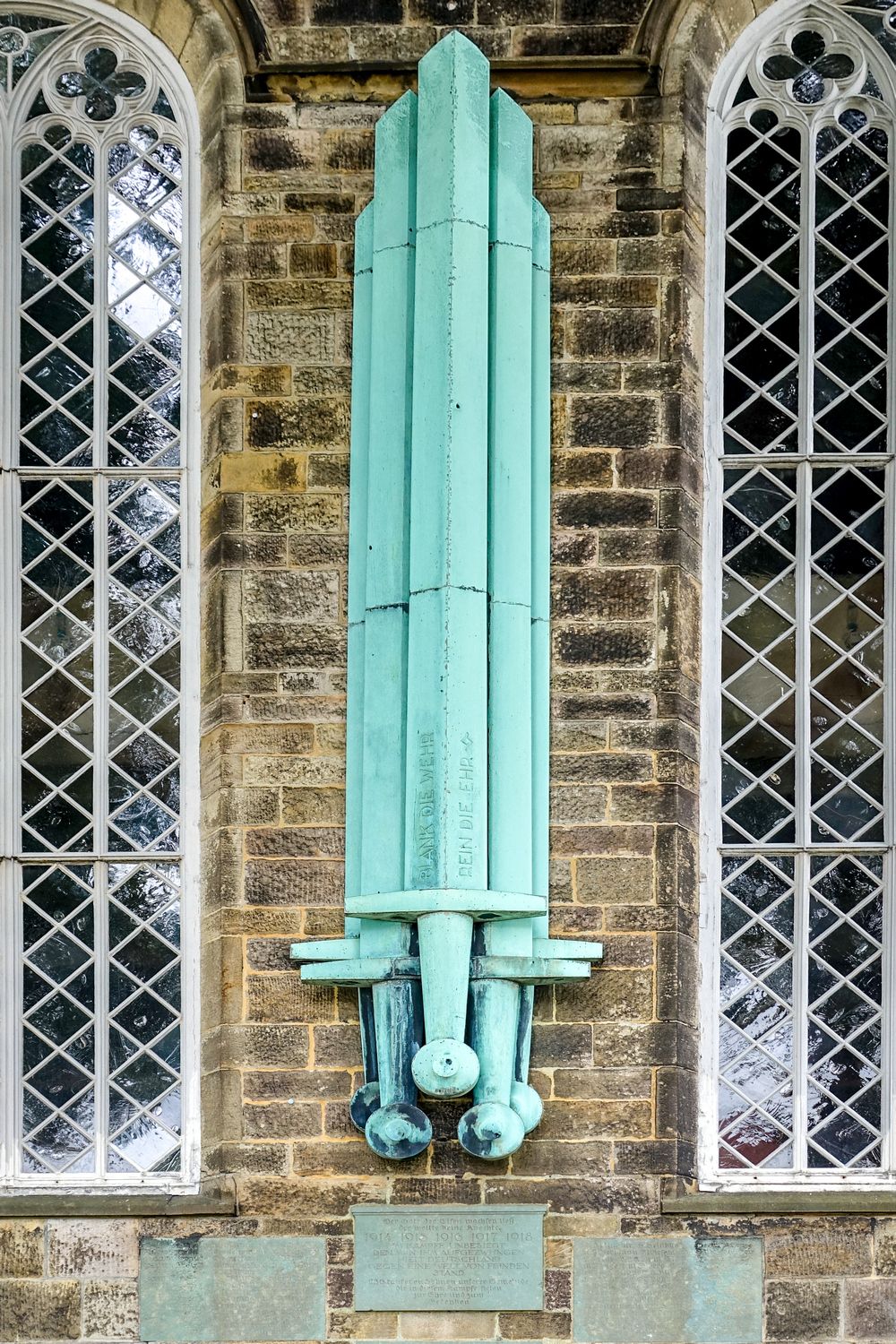 Der Familien- und Heimatforscher Peter Kuhweide beschreibt dieses Werk: Ich glaube, man kann erkennen, was beabsichtigt war. Die Schwerter nehmen mit den Klingen und den Parierstangen die vertikalen und horizontalen Elemente der neogotischen Fenster auf. Sie wirken wie zusammengeschobene Fenstersegmente. Die Bündelung kann ein Zitat der römischen fasces, des Rutenbündels der Liktoren, als Machtsymbol sein, wie es ja auch von den italienischen Faschisten verwendet wurde. Der Wechsel vom Relief der Fenster zur Vollplastik der Schwerter, auch vom Stein zur Bronze, unterstreicht die zentrale Bedeutung der Schwerter. Die Fenster werden zu Begleitelementen, die Gruppierung erinnert an gotische Flügelaltäre. Damit ist nicht nur der stilgeschichtliche Bezug hergestellt, sondern auch die Hierarchie. Der Mittelteil des Altars ist immer der wichtigste. Die Gruppe Fenster- Schwerter-Fenster erweckt den Anschein, als habe der Künstler mit seiner Hinzufügung nicht schlichte Applikation betrieben, sondern eine Botschaft, und zwar die zentrale Botschaft, erst sichtbar gemacht. Religion und Pseudo-Religion werden perfekt verquickt. Das ist gestalterisch gelungen, in Absicht und Methode perfide.