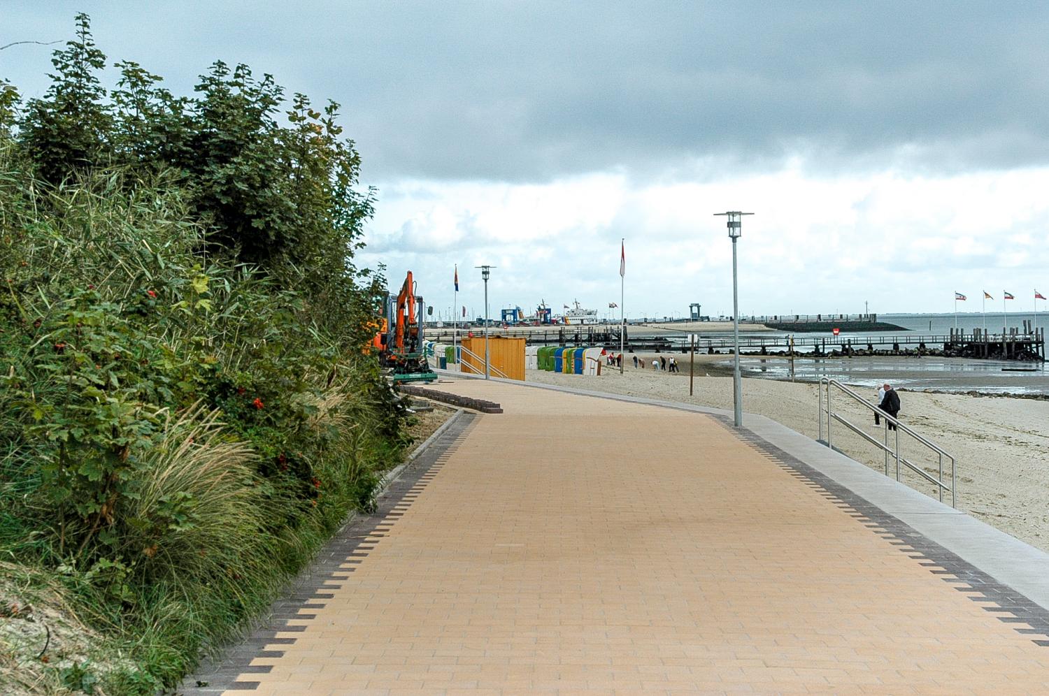 Die neuen Bäume waren 2006 am Sandwall schon gepflanzt. Nach vielen Überlegungen, Diskussionen, Änderungswünschen, Eingaben und Beschlüssen wurde 2008 auch die bauliche Erneuerung des Sandwalls in Angriff genommen. Das stabile Pflaster, das zukünftig auch schwere Lieferwagen verkraften können musste, war schnell gelegt. Im Bereich des seeseitigen Sandwalls mussten zusätzlich tragfähige, frostsichere Fundamente gesetzt werden. Die alte Strandmauer wurde entfernt, größere Erdbewegungen waren dabei notwendig. Nach der Freigabe für den Fußgängerverkehr von Teilbereichen der landseitigen Promenade wurde der Bereich unter den Bäumen mit einem Rollrasen versehen. Vor der neuen Tribüne entstanden Volleyballfelder. Anfang Juli 2008 waren die Baumaßnahmen bis auf wenige Restarbeiten fristgerecht fertiggestellt worden. Der Übergang von Promenade zum Strand ist fließender geworden, besonders schön gelungen sind die Tribünen an den Volleyballplätzen.