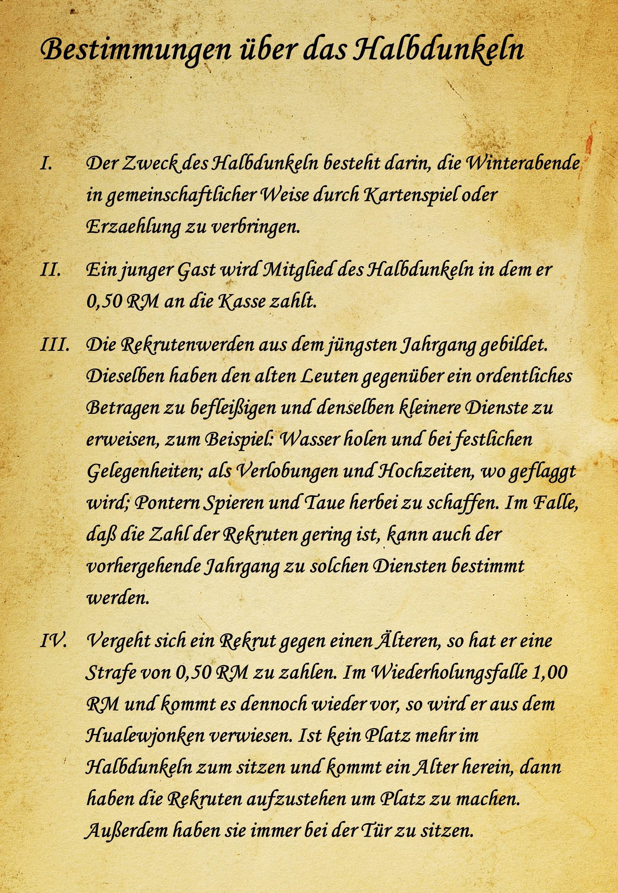 Sehr beliebt wie auch in der übrigen Winterzeit war die Gewohnheit des „Aufsitzens“: Nachbarn besuchten sich gegenseitig ohne Voranmeldung gegenseitig. Dann saß man in der Wohnstube beisammen, erzählte sich im Schein der Öllampen wunderliche Sagen und berichtete von Erlebnissen aus der Seefahrt, während die Frauen strickten und die Männer an ihren Tabakspfeifen sogen.