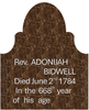 Abraham Collins war ein lokaler Steinmetz in Tyringham (heute Monterey, Neuengland), der den Grabstein und insbesondere den ungewöhnlichen Fußstein für Reverend Adonijah Bidwell anfertigte. Jeder Grabsteinmetz des 18. Jahrhunderts machte gelegentlich Fehler, doch in der Regel korrigierten sie diese besser als Abraham Collins. Die wörtliche Inschrift lautet: „Reverend ADONIJAH BIDWELL starb am 2. Juni 1784 im 668. Lebensjahr.“