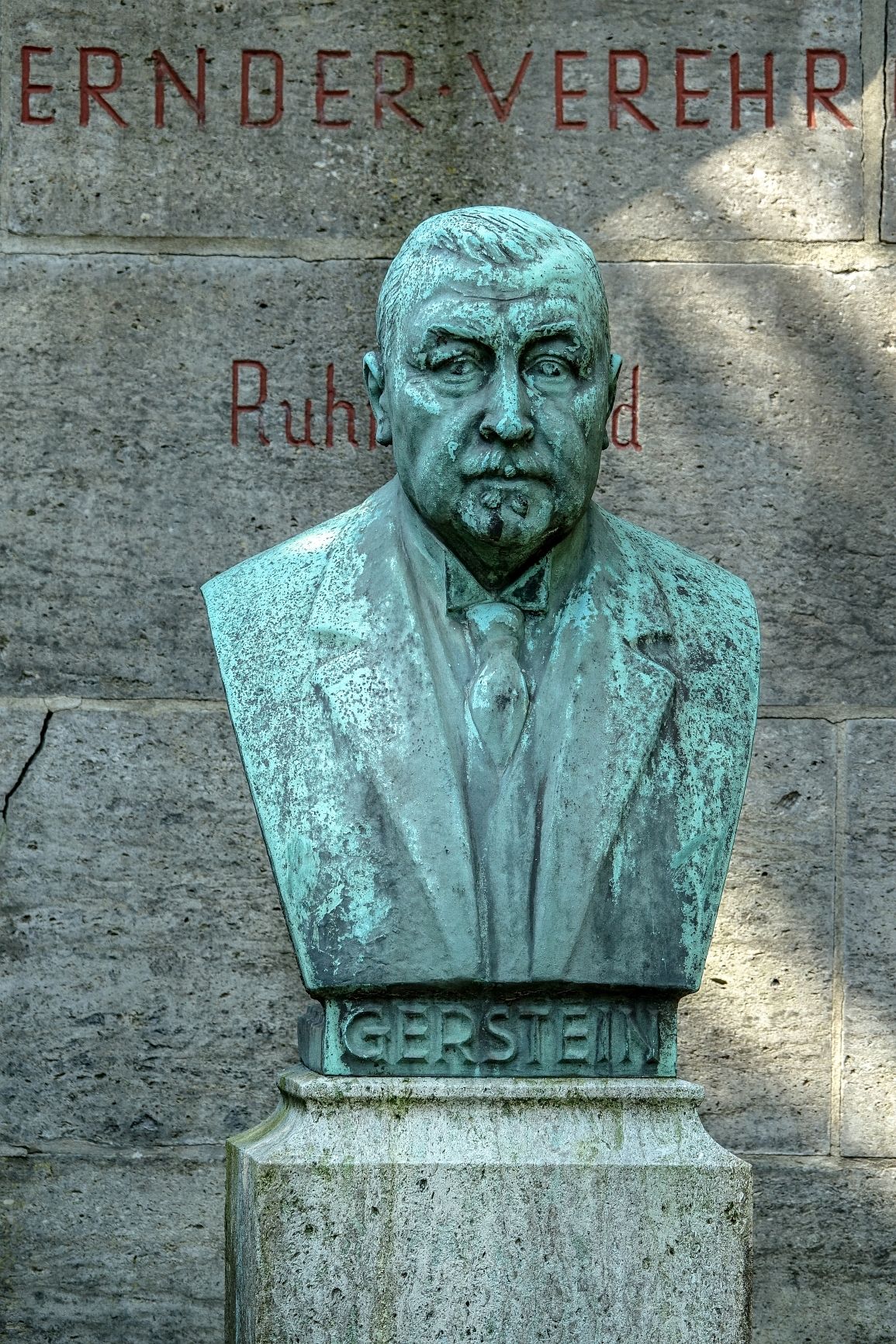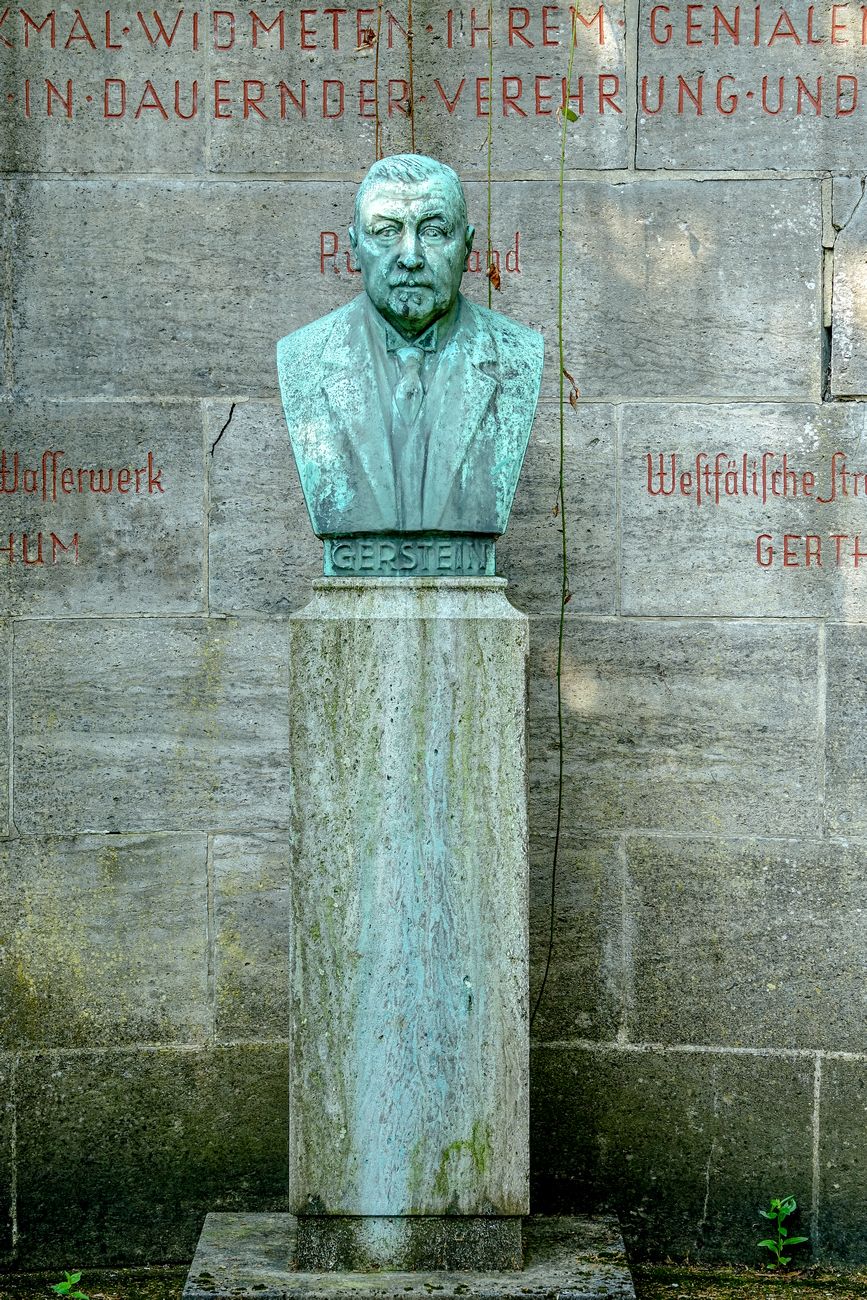 Hier ruht in Gott nach arbeitsreichem und gesegnetem Leben der königliche Polizeipräsident und Landrat des Kreises Bochum Karl Gerstein, geboren am 10. Januar 1864 in Rietberg-Westfalen, gestorben am 19. Juni 1924 in Tübingen. Seine Werke sprechen für ihn. Seit letztes Wort war: Behaltet die Menschen lieb.