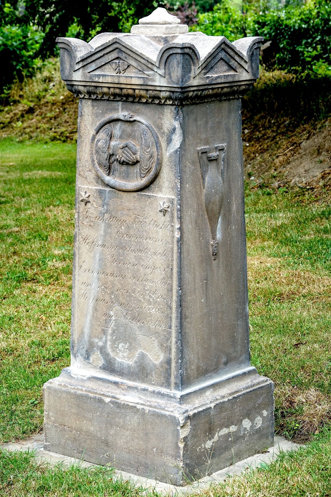 Diese Stele aus dem 19. Jahrhundert zeichnet sich durch drei Faktoren besonders aus. Zum einen ist auf einer Seite ein direkter Zusammenhang zwischen Bild und Text zu konstatieren, den wir bislang in dieser Eindeutigkeit nirgends feststellen konnten. Zum anderen unterliegt gerade an dieser Stelle in Abgrenzung zu den älteren Grabsteinen des historischen Friedhofs der Text orthographischen Regeln, was sich darin bemerkbar macht, dass strukturiert Satzzeichen platziert wurden. Der dritte besondere Punkt ist die Vielzahl an antiken Symbolen, wobei die Urne zudem auch auf eine Urnenbestattung verweisen könnte womit ein weiterer Unterschied zu den meisten anderen Gräbern auftaucht, wo die Erdbestattung das übliche Verfahren darstellte. Des Weiteren ist die Widmung der trauernden Hinterbliebenen auf Frontseite sehr interessant, gibt sie doch Aufschluss über eine Funktion der Stele für die Angehörigen.