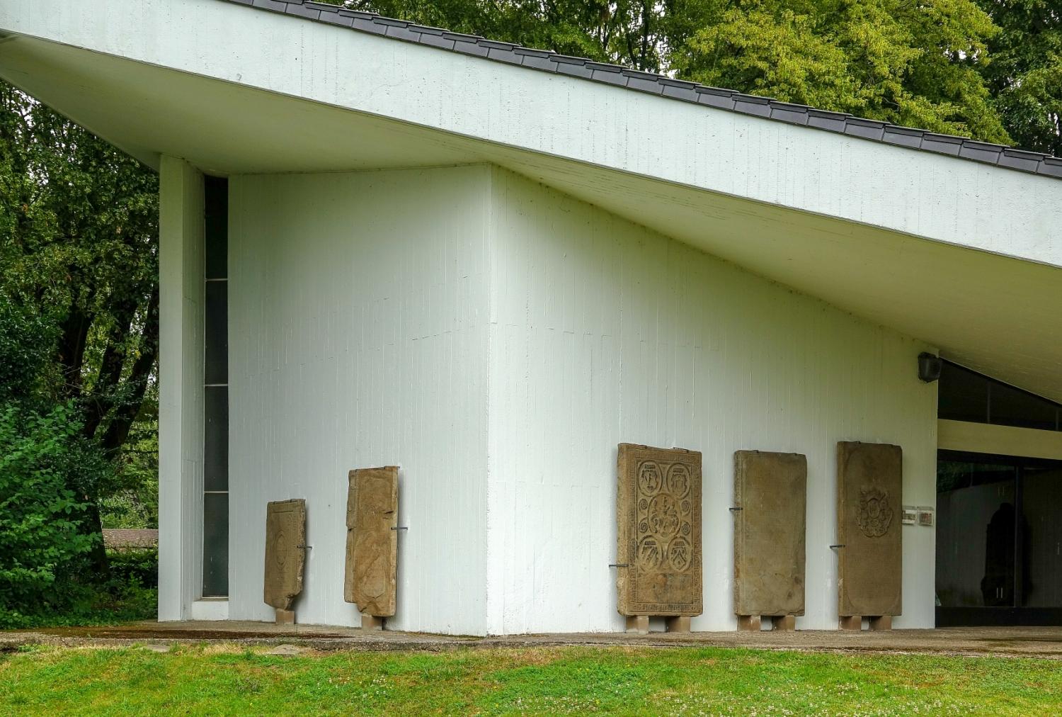 Zahlreiche Grabplatten befanden sich im Boden der Kirche. Geistlichkeit und örtlicher Adel wurden in ihr bestattet. Fünf der Platten hängen heute an den Sichtbetonwänden der Friedhofskapelle, die den historischen Kirchhof vom neueren Friedhof trennt.