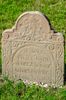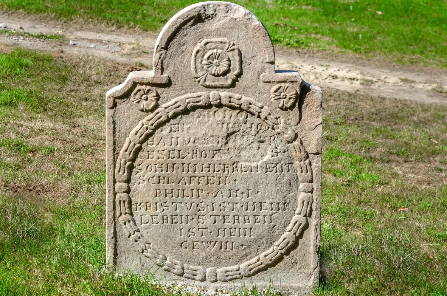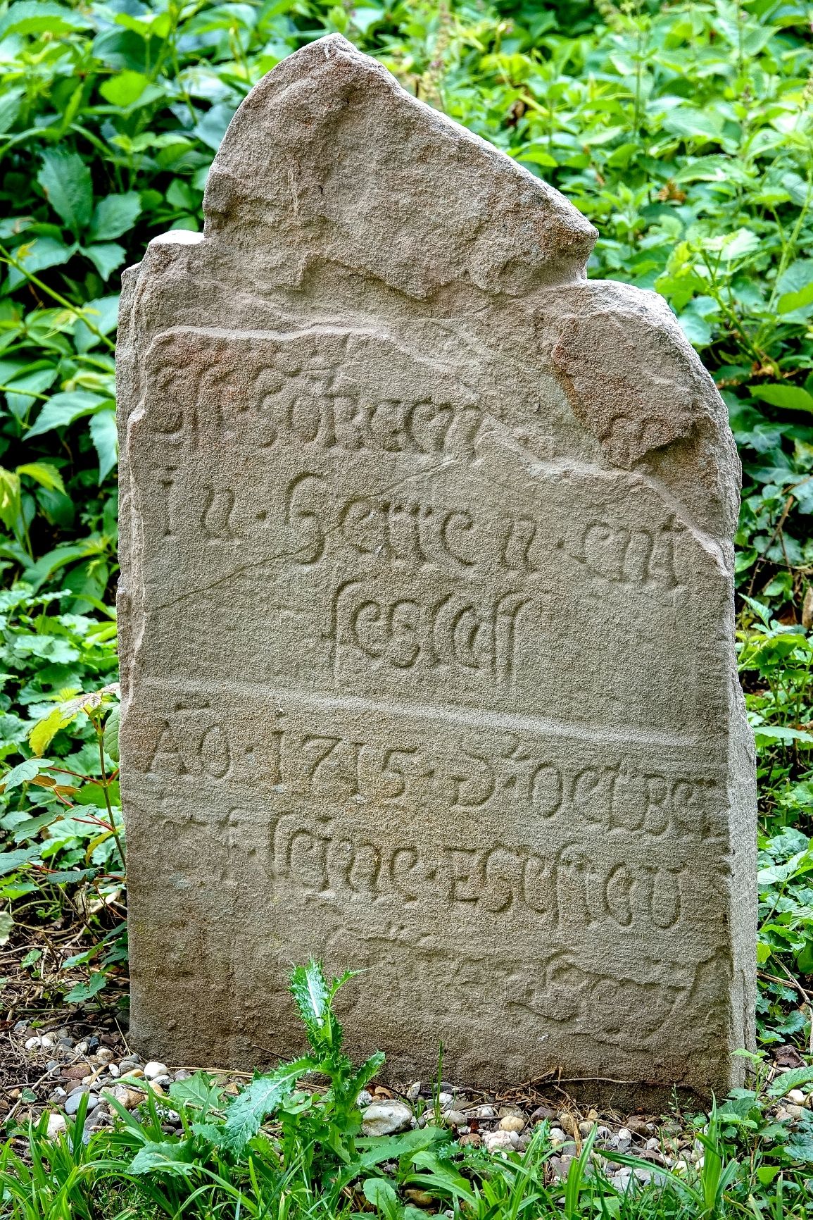 Ein weiteres typisches Merkmal für einige Grabsteine des historischen Friedhofs ist die alleinige Nennung des Todesjahrs und des Alters, also das Fehlen des Geburtsjahres. Die Abkürzung am Schluss bedeutet Im Herrn Ent Schlafen. Der Name könnte nach älteren Listen auch FRILENKUS sein. Zudem sind die Witterungsschäden an diesem Stein auffällig groß.