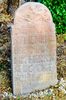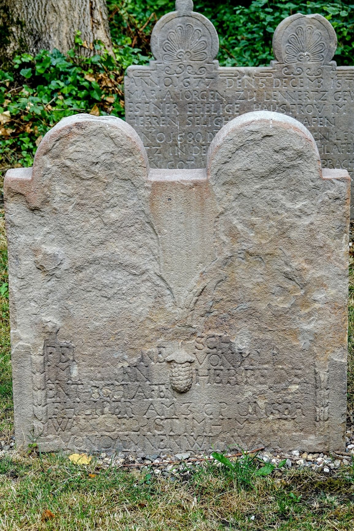 Bei diesem Exemplar handelt es sich um einen außergewöhnlichen Grabstein, der nur bedingt „Teil“ des historischen Friedhofs zu sein scheint. Die erste Besonderheit ist, dass auf seiner linken Seiten mit einer Minuskel und auf seiner rechten Seite mit einer Majuskel geschrieben wurde. Dies lässt sich eventuell durch einen anderen Steinmetz erklären, die ja wiederum auch eigene Stile besaßen. Die eigentliche Absonderlichkeit ist das Material, aus dem der Stein besteht. Während sonst ausnahmslos alle Grabsteine aus einer Form des Ruhrsandsteins hergestellt werden sind, hat man scheinbar hier mit massiverem, felsartigem Gestein gearbeitet.