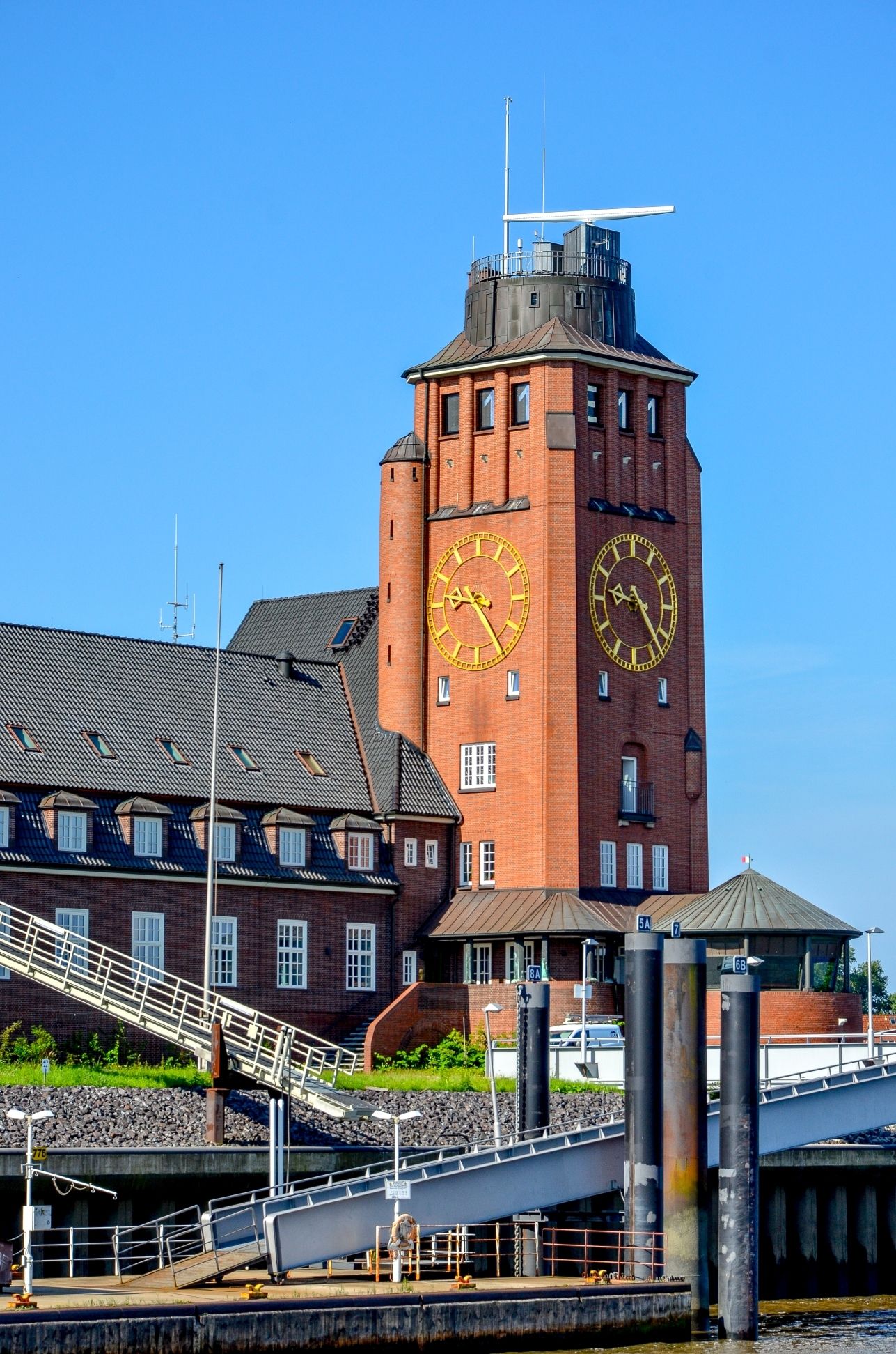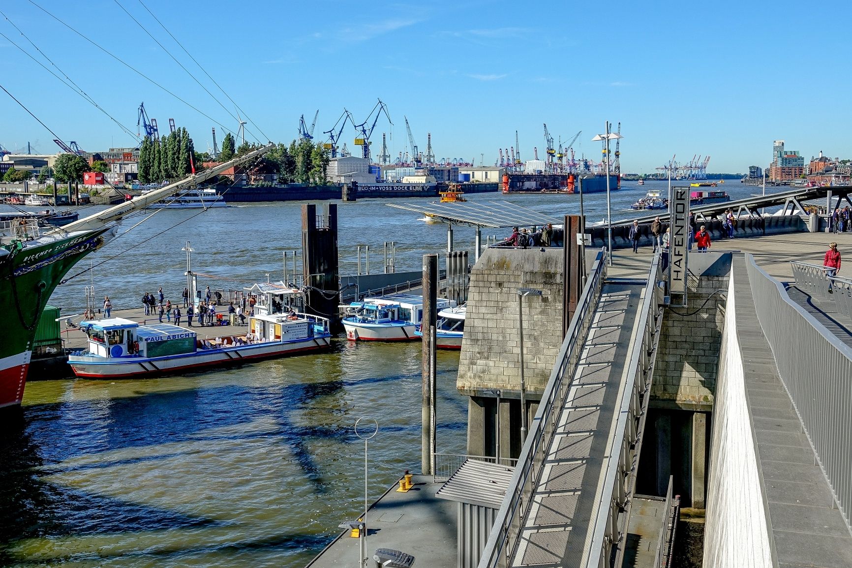 ▲ Die Landungsbrücken entstanden in der ersten Hälfte des 19. Jahrhunderts, um die Dampfschiffe möglichst einfach mit Kohle zu befüllen. Später wurden hier auch große Passagierschiffe abgefertigt. Ab 1907 wurden die Schiffsanlegestellen auf schwimmende Pontons verlegt, die auch heute noch in einer Gesamtlänge von 688 Metern genutzt werden. Allerdings legen hier keine großen Dampfer mehr an, sondern die Linienfähren der HADAG sowie Rundfahrt- und Ausflugsboote. In dem markanten und 205 Meter langen früheren Abfertigungsgebäude, das ebenfalls zu Beginn des 20. Jahrhunderts parallel zu den mittleren Anlegerbrücken errichtet wurde, befindet sich heute unter anderem ein originelles Hard Rock Café. An der Wasserseite des Turms ist unter der Uhr eine Pegelanzeige angebracht.
