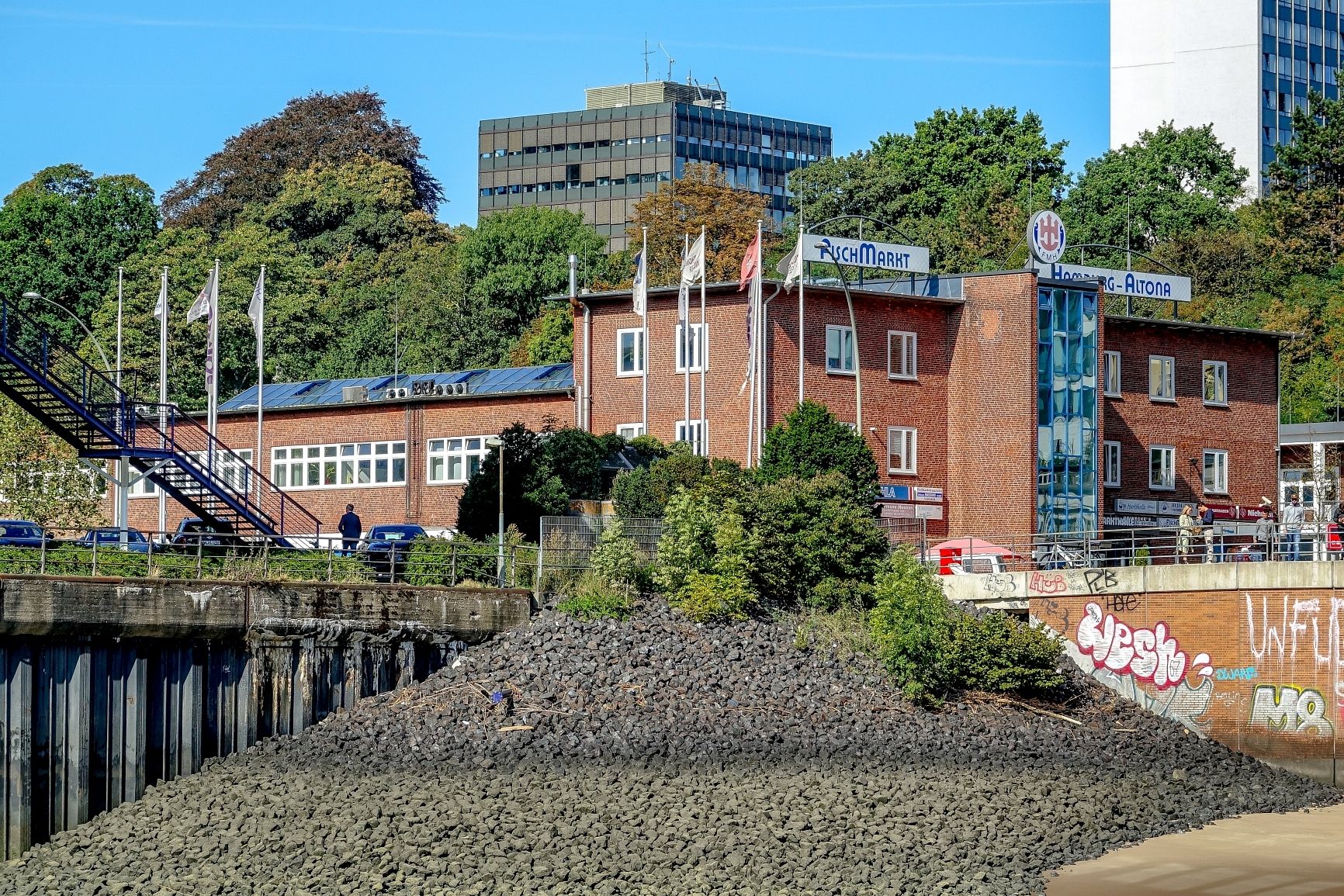▲ An eine römische Basilika erinnert die im Jahr 1896 von Kaiser Wilhelm II. eingeweihte Altonaer Fischauktionshalle. Hier wurde bis zum zweiten Weltkrieg angelandeter Fisch gehandelt und versteigert. Später diente der rote Backsteinbau als Lagerhalle, die in den 1970er Jahren in ein Kultur- und Veranstaltungszentrum umgewandelt wurde. Heute ist die bis zu 3.500 Besuchern fassende Halle unter privater Bewirtschaftung Schauplatz von allerlei Events und am Sonntagmorgen musikalischer Mittelpunkt des Fischmarktes. Während vor den Türen gehandelt wird, spielen hier Rock- und Popgruppen vor allem Klassiker aus diesen Genres.