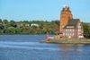 ▲ Nachdem die Hafenfähre 62 in Finkenwerder abgelegt hat, hält sie schon nach knapp 2 Minuten wieder an der Anlegestelle Bubendey Ufer, wo selten Passagiere in größerer Zahl zu- oder aussteigen. Wenn die Hafenfähre um den nun folgenden kleinen Landvorsprung herum fährt, sieht man das Lotsenhaus Seemannshöft vom Wasser aus in voller Pracht. In dem 1914 errichteten Backsteinbau mit dem Signal- und Beobachtungsturm sind heute die Hamburger Hafenlotsen und weitere Institutionen der Hafenverwaltung untergebracht.