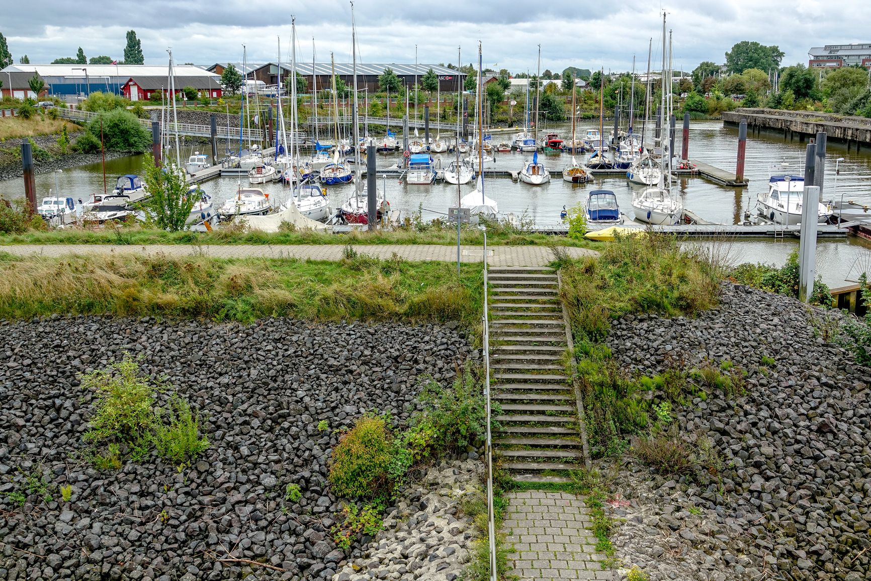 Anleger mit Sportbooten und Arbeitsschiffen im Steendiekkanal. Früher war der Kanal Teil der deutschen Werft, die dort am Ufer der Elbe Schiffe baute. Im Hintergrund nahe des Anlegers „Rüschpark“ ist das Hochhaus des Seaside Innovationszentrum, direkt neben dem Airbus Technologie Park zu erkennen.