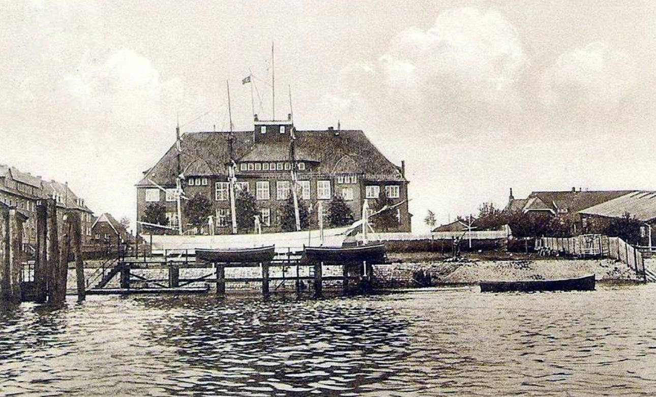 ▲ Die Ansichtskarte (ca. 1927) zeigt die 1912/13 gebaute „Deutschen Seemannsschule Finkenwärder“ dessen Gebäude sich noch heute am Anleger der HADAG befindet.