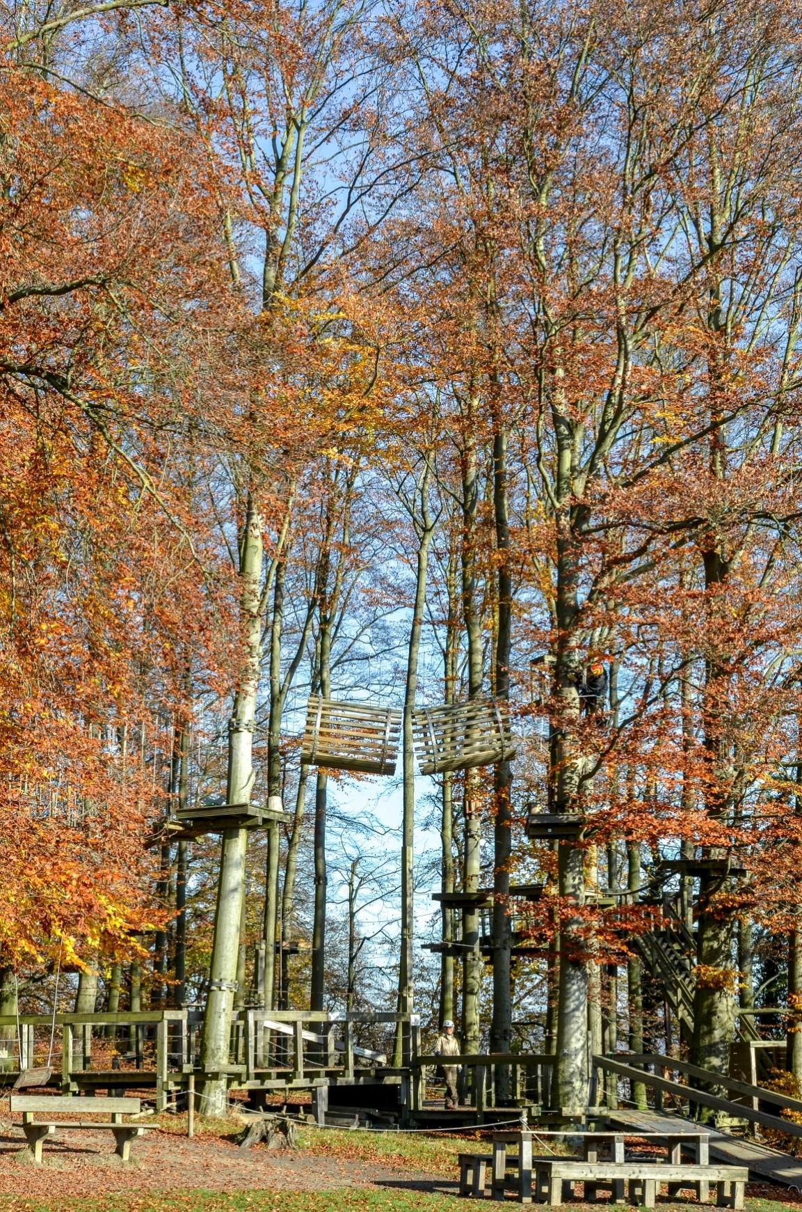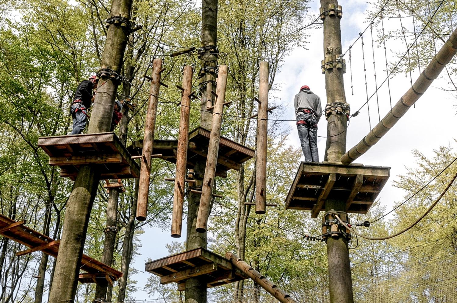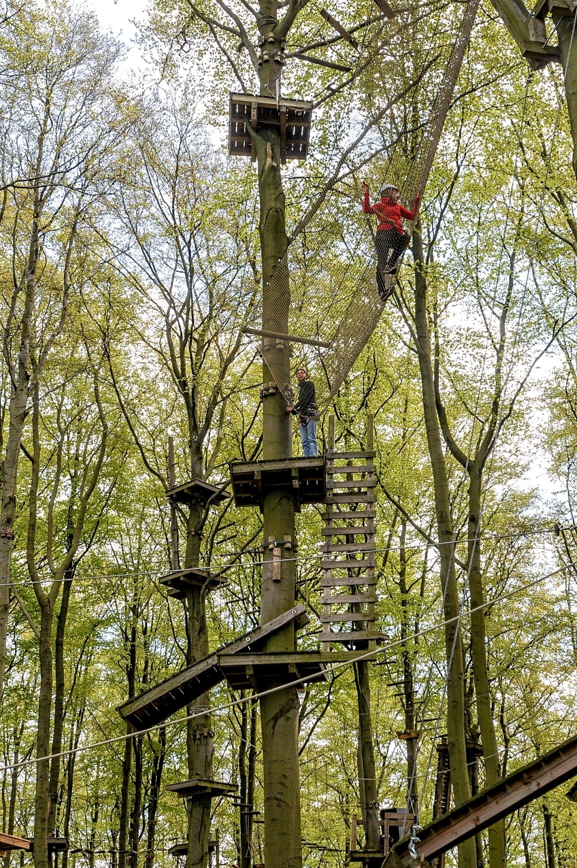 Im Juli 2008 eröffnete der Kletterpark auf dem Harkortberg. 14 Parcours unterschiedlicher Schwierigkeitsgrade bieten für jeden die passende Herausforderung. Schon Sechsjährige können hier in Begleitung eines Erwachsenen ihre erste Klettererfahrung sammeln. Bevor es losgeht, wird jeder Besucher mit einer Sicherheitsausrüstung ausgestattet. Im Anschluss gibt es eine Einweisung in die korrekte Selbstsicherung mittels zweier Karabiner und einer Seilrolle in den verschiedenen Übungen. Erst wenn man das Gezeigte einmal vorgeführt hat, um zu demonstrieren, dass man in der Lage ist, sich in allen Situationen richtig zu sichern, wird man auf die einzelnen Parcours losgelassen. Eine Farbcodierung weist dabei die unterschiedlichen Schwierigkeitsgerade der jeweiligen Strecken aus. Der Hochseilgarten ist in einen natürlichen Baumbestand integriert. Plattformen auf Höhen von einem bis hin zu 18 Metern über dem Boden sind durch verschiedene Elemente miteinander verbunden, die es zu überwinden gilt. Das können Seile, Stege, Wackelbalken, Bänder, Tonnen oder Strickleitern sein. Besonders viel Spaß machen die Seilrutschen, von denen die längste 140 Meter lang ist. Je nach Höhe kostet es manchmal schon Überwindung und eine gehörige Portion Vertrauen in die Ausrüstung, um sich in die Tiefe zu stürzen, unterm Strich steht am Ende jedoch immer eine Menge Spaß. Und wen unterwegs der Mut verlässt, der lässt sich von einem Sicherheitsmitarbeiter, einem sogenannten „weißen Helm“, retten.