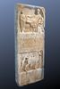 In Muschelnische Totenmahl mit auf Kline gelagertem Mann in Tunica und Mantel, in der Linken mappa. Links frontal stehender Diener. Vorn Tisch mit Gefäßen und große Henkelflasche. Nische mit tordiertem Band gerahmt, in den Zwickeln Blattrosetten. Darunter rahmenloses Schriftfeld und Sockelbild mit Calo (mit Helm?) und Pferd mit langer Satteldecke.