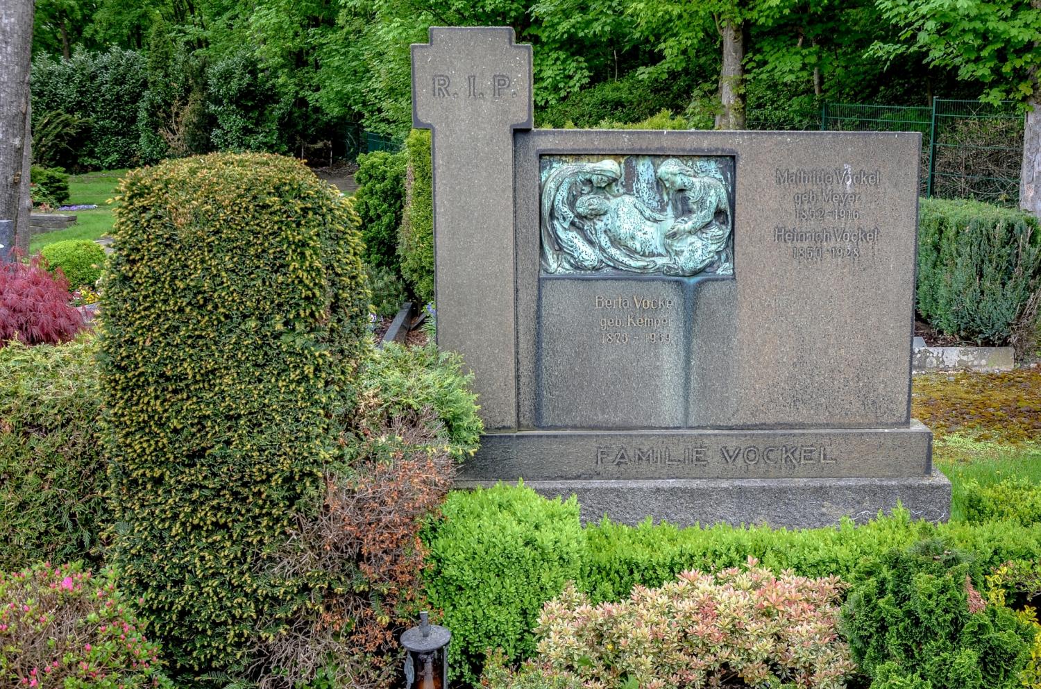 Etwa in der Mitte des Friedhofs auf östlicher Seite findet man ein bereits von Weitem sichtbares Grabmal, das sich von den anderen gestalterisch derart abhebt, dass es mit seinem Konzept scheinbar im Nichts zu schweben scheint. Nirgendwo sonst auf dem Friedhof finden sich Anklänge oder Ähnlichkeiten. Ein Grabstein aus weißem Stein mit einer gräulichen Patina markiert die Grabstätte einer Familie, das Haupt des Grabsteins bildet dabei eine monumentale Steinskulptur aus ineinander verwobenen Steinbändern von denen zackenförmige Steinstrukturen abgehen. Die Struktur hat die Gesamtform eines Quaders, der auf einer Steinplatte sitzt, die den Namen der Familie trägt. Die Gestaltung setzt sich auf der Rückseite und den Seiten fort.