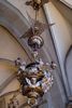 ▲ Der Blasiusaltar im Mittelschiff ist zugleich ein Epitaph. Der heilige Blasius wird mit dem „Blasiussegen“ gegen Halsleiden angerufen und ist Beschützer der Wollweber, da er mit eisernen Wollkämmen gemartert wurde. Zugleich ist der Altar das Epitaph des Domkellners Theodor von Plettenberg. Er starb der Inschrift zufolge 1643. Das Epitaph aus der Zeit des Manierismus, inschriftlich auf 1618/19 zu datieren, zeigt in der Sockelzone vier qualitätvoll gearbeitete Putten, die in geschraubten Bewegungen und manierierter Körperlichkeit das Hauptgeschoss tragen. In der Mitte des Sockelgeschosses befindet sich die Inschriftkartusche, während die linke Darstellung Christus in der Vorhölle zeigt und auf der rechten Seite die Grablegung des Herrn dargestellt ist. Eindrucksvoll ist das dornengekrönte, vielleicht dem 19. Jahrhundert zuzuordnende Christushaupt in der darüberliegenden Sockelzone, das von Rollwerkornamenten und Beschlagwerkelementen begleitet wird. Die zentrale Nische des Hauptgeschosses umfasst in einem Hochrelief ein Vesperbild in pyramidalem Aufbau, das Maria und den verstorbenen Christus in bewegten Haltungen darstellt. Typisch für die Entstehungszeit des Epitaphs sind die Gegensätzlichkeit der Haltungsmotive und die manieristisch übersteigerte Längung der Figuren wie auch die bewegte Oberflächenstruktur des Christuskörpers. Das durch blaue Marmorsäulen mit vergoldeten Kompositkapitellen gegliederte Geschoss wird seitlich links von einem bärtigen Apostel und rechts von einem heiligen Bischof gerahmt, während ganz außen die Anbetung der Heiligen Drei Könige und die Darbringung im Tempel auf eigenen rundbogigen Relieftafeln gleichsam wie zur Seite geklappte Gemäldetafeln erscheinen. Sie wachsen über Voluten mit Ornamenten und Kopfschmuck auf. Über den beiden stehenden Gestalten erscheint links eine Darstellung des Abendmahls und rechts die Szene mit dem ungläubigen Thomas. Den oberen Abschluss des Epitaphs bildet ein reicher Aufbau, zu dem Gebälk tragende Putten und eine Sockelzone mit den Wappen Plettenberg, Wendt, Steinhausen und Heiden vermitteln. In diesem bekrönenden Abschluss erscheint im Flachrelief der auferstandene Christus.