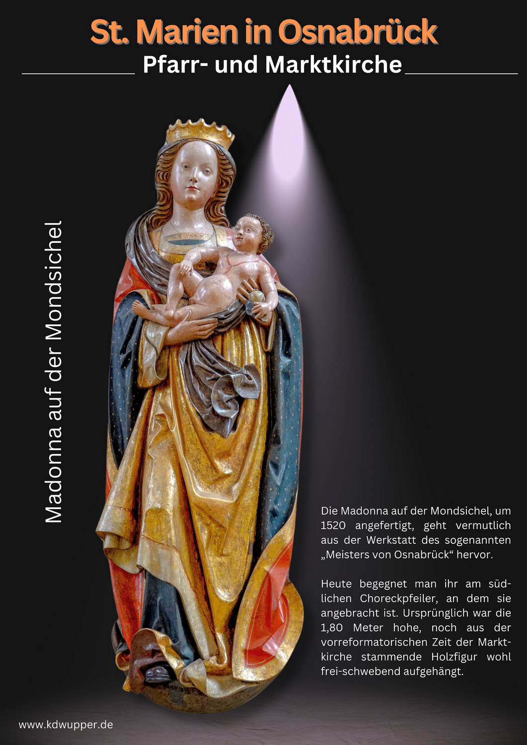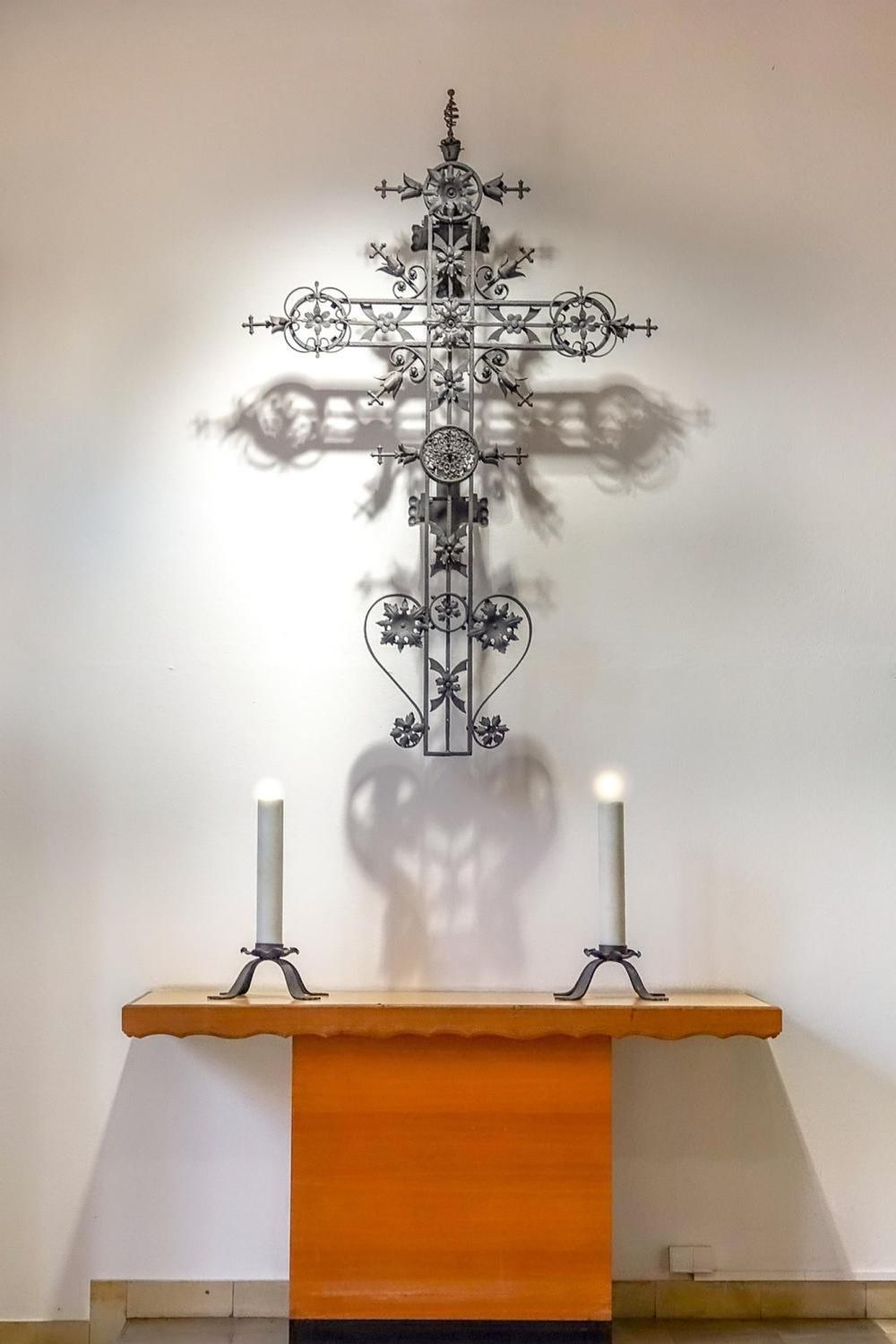 Über dem Altar wacht die über 2m große, bemalte Holzplastik des Erzengels St. Michael, eine Nachbildung der berühmten Statue in St. Andreas in Köln aus dem 15. Jahrhundert. Die Figur scheint Ritter und Engel gleichzeitig sein zu wollen, trägt Schild und Schwert, Flügel und Stab und erzählt vom Triumph gegen finstere Gestalten.