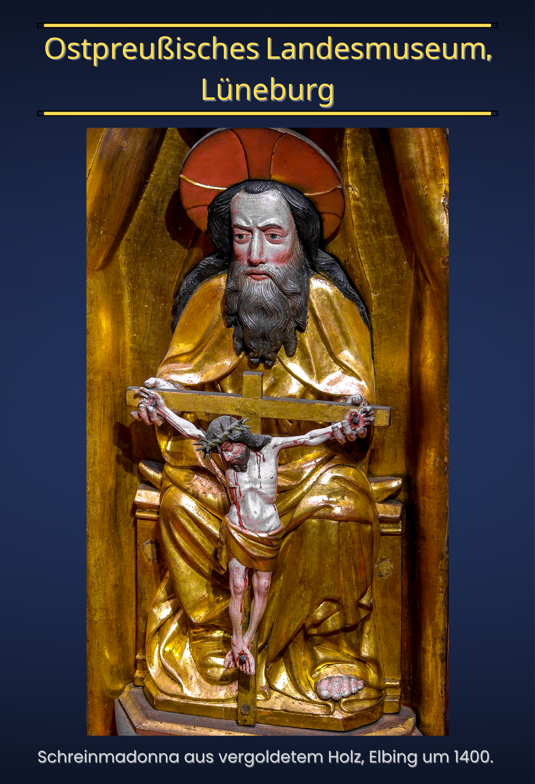 Im oberen Register kommt der Oberkörper einer festlich gekleideten Figur, die mit den Symbolen des Auferstandenen – Kreuzaura und Siegesfahne – ausgestattet ist, hinter dem Kopfbalken des Kreuzes hervor. Ferner trägt sie eine kleine, ihr ähnlich gekleidete Gestalt im Arm. Seitlich sind die Tücher haltenden Figuren von Sonne und Mond angebracht.