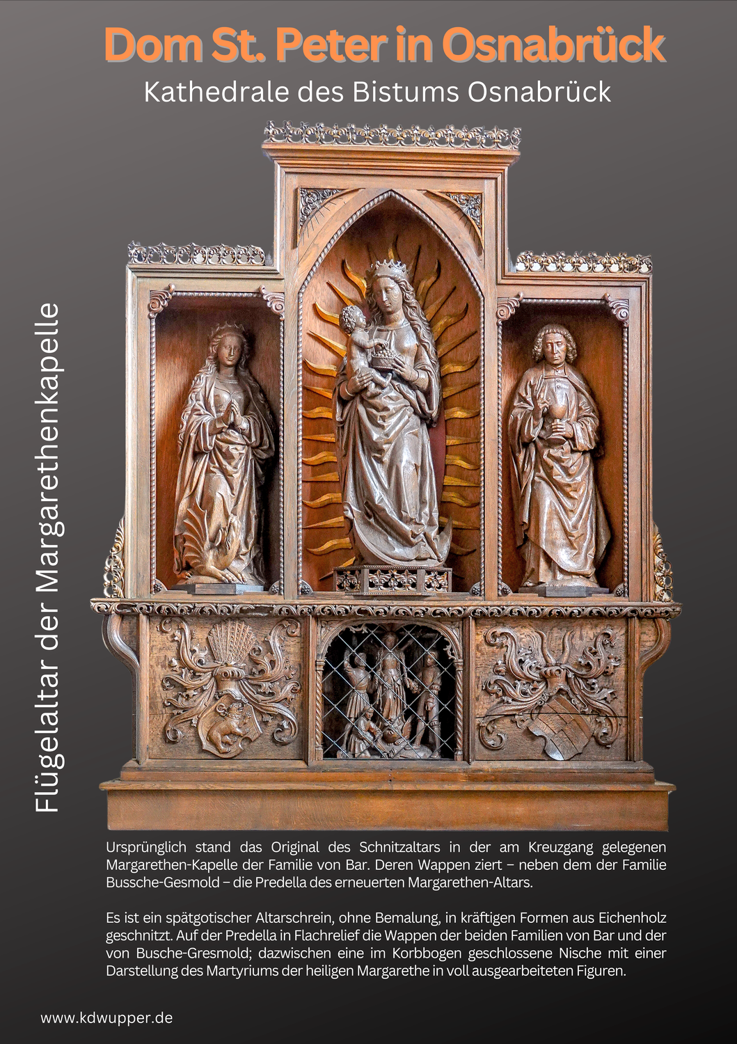 Das bedeutende, äußerst fein gearbeitete Altarrelief der Spätgotik stammt ursprünglich aus dem ehemaligen Zisterzienserinnenkloster Vinnenberg und wurde vermutlich kurz nach 1466 von einem Westfälischen Bildhauer geschaffen, der als Meister der Heiligen Sippe bezeichnet wird. Es zeigt in der Mitte die heilige Anna Selbdritt (Anna, Maria und Jesuskind) umgeben von weiteren Mitgliedern der Heiligen Sippe, d. h. den Vorfahren bzw. Verwandten Jesu und Mariens, wie sie den Evangelienberichten und apokryphen Erzählungen zu entnehmen sind, darunter üblicherweise Johannes der Täufer und die Alphäus und Zebedäussöhne als Vettern Christi sowie der heilige Servatius. Die im 15. und 16. Jahrhundert äußert beliebte Darstellung fußt auf der Erzählung einer Legenden-Sammlung, der sogenannten Legenda aurea, die um 1280 entstand. Hier wird berichtet, dass Anna, die Mutter Mariens, dreimal verheiratet war und dass aus diesen Ehen jeweils Kinder hervorgingen. Dargestellt wurden ihre anderen beiden Ehemänner sowie die Töchter mit ihren Männern und Kindern.