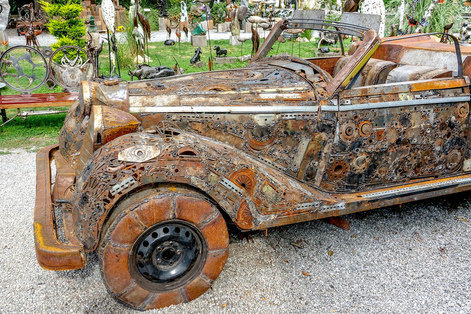 Im Frühjahr 2022 reifte während eines Telefonats zwischen Ray und Bastian Müller ein neuer Plan: Diesmal sollte kein Lebewesen aus der afrikanischen Tierwelt nachgebaut werden, sondern ein Auto. Ein originalgroßer Nachbau, aber aus alten Autoteilen. Es musste natürlich ein Mercedes sein. „In Afrika ist der Mercedes der Inbegriff von Deutschland“, schwärmt der Mann aus Zimbabwe. Bastian Müller fand über Umwegen ein besonderes Exemplar. Ein Bommeraner besitzt einen „Mercedes 170 S – A Cabrio“. Zwischen 1949 und 1951 wurden nur 840 Stück des Edelgefährts gebaut. Etwa 250 sollen noch existieren. An einem Wochenende fotografierte, vermaß Ray Chataira den Wagen und bog aus Rundstäben ein Drahtgestell – das Grundgerüst des Kunstwerks.