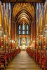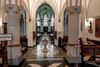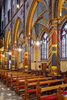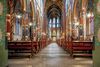Das Rot der Backsteine und der dunkle Eichenholzton der neogotischen Ausstattung schaffen die wohltuende Atmosphäre in diesem Kirchenraum. Oberhalb der Tür segnet Christus in Gestalt einer flämischen Eichenskulptur die Ein- und Ausgehenden, die seinen Segen erbitten: „Benedictus benedicat“ („Der Gesegnete möge segnen“).
