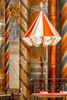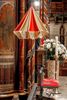 Gegenüber findet sich als weiteres Zeichen ein gelb-rot gestreifter Seidenschirm, genannt „Padiglione“ oder „Umbraculum“. Der Schirm lässt seine Flügel hängen – erst wenn der amtierende Papst stirbt, wird er aufgespannt.