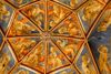 Die Gewölbemalereien in der Vierung: Die Deckenmalereien zeigen in der Vierung die Huldigung des Lamm Gottes durch die 24 Ältesten der Geheimen Offenbarung. In den Zwickelkappen jeweils vier eckbezogene stehende Figuren, die Kronen reichen, und in den Sternkappen jeweils ein Sitzender mit einem Musikinstrument.