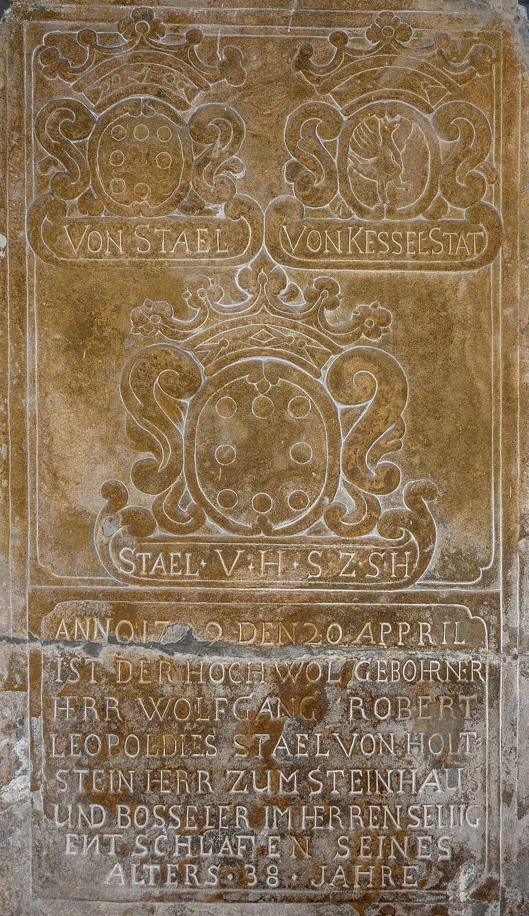 Grabstein für Wolfgang Robert Leopold Stael von Holstein (geb. 1691, gest. 1729) in der Kapelle auf Steinhausen, Inschrift: ANN0 1729 DEN 20. APRIL IST DER H0CHWOHLGEBOHRNER HERR WOLFGANG ROBERT LEOPOLDIES STAEL VON HOLIISTEIN HERR ZUM STEINHAUS UND BOSSELER IM HERREN SELIIG ENTSCHLAEEN SEINES ALTERS 38 JAHRE; neben dem persönlichen Wappen Stael von Holstein in der Mitte darüber die elterlichen Wappen Stael von Holstein und von Kesselstadt sowie darunter die Wappen der beiden Großmütter, links väterlicher-, rechts mütterlicherseits, von Frentz und von Remchingen (auf der Grabplatte verschrieben „von dem Singgn“)